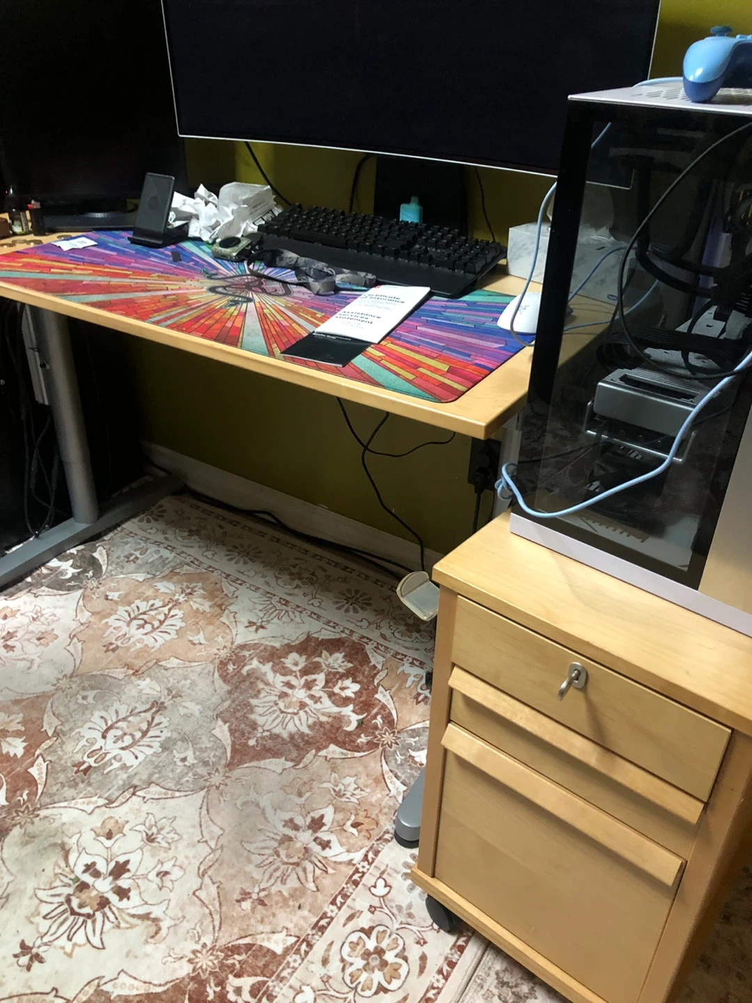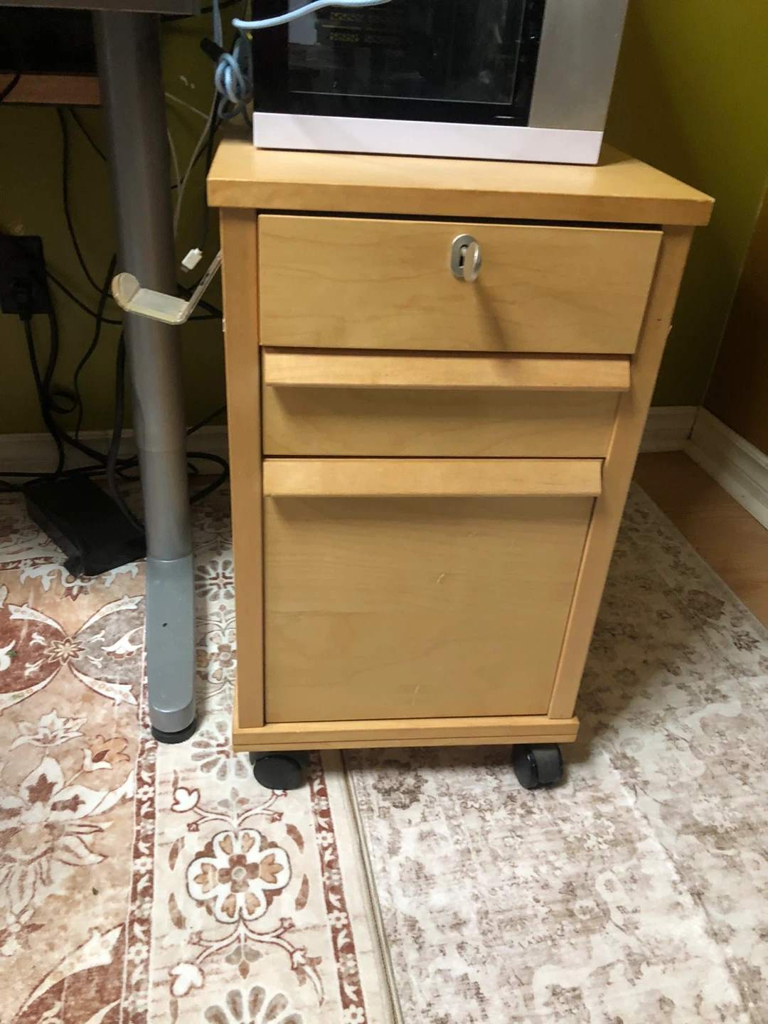 A handy rolling pedestal with three drawers, perfect for organizing your workspace. The top drawer includes a lock and key for securing important items. Its light wood finish fits well with most desk setups.