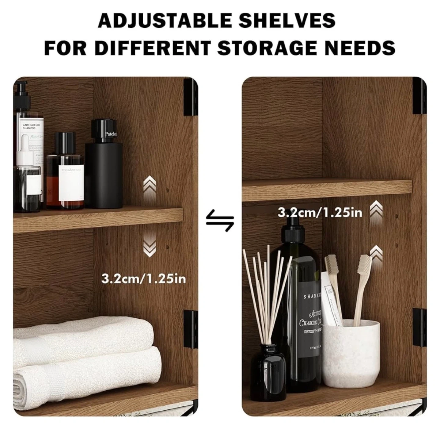 This bathroom wall cabinet features a rustic wood finish with rattan door panels. It has hidden storage cabinets with adjustable shelves and an open lower shelf with a removable towel bar. The overall dimensions are 58cm (H) x 39cm (W) x 18cm (D).