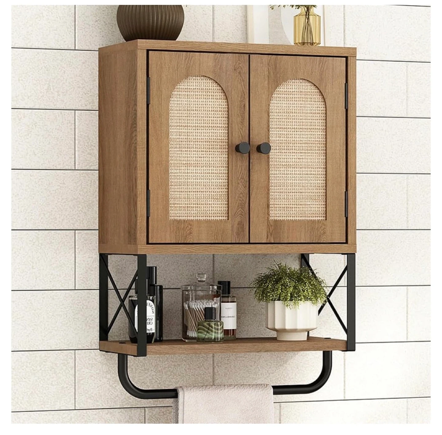 Wood Bathroom Wall Cabinet with Rattan Inlay and Towel Bar