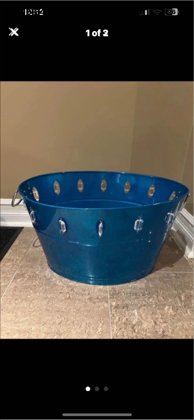 This blue metal tub features decorative clear gem-like accents around the rim. It has two sturdy handles for easy carrying. This tub's design makes it suitable for a variety of uses, from decorative displays to functional storage.