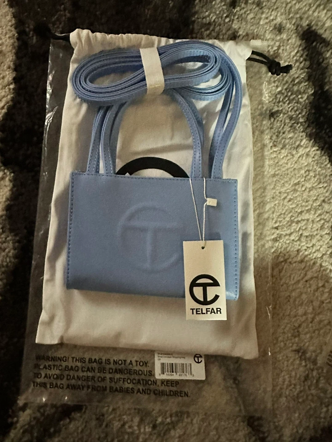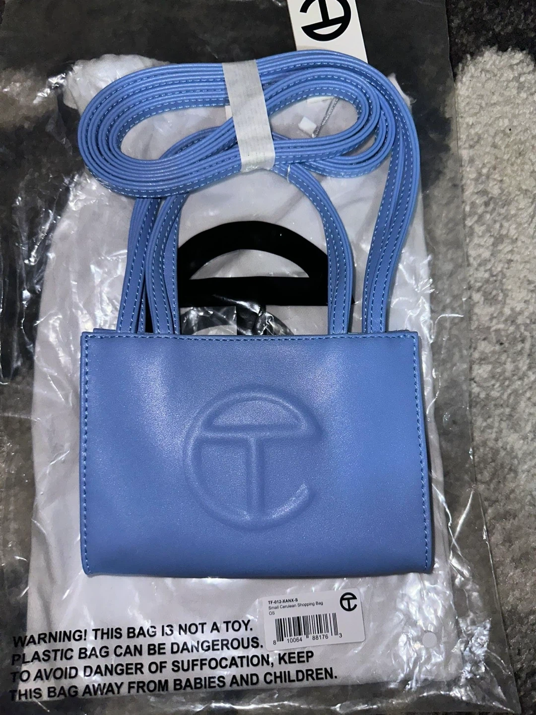 Small Telfar shopping bag in baby blue. Includes dust bag and strap. Outer is 100% polyurethane, lining is 100% polyester.