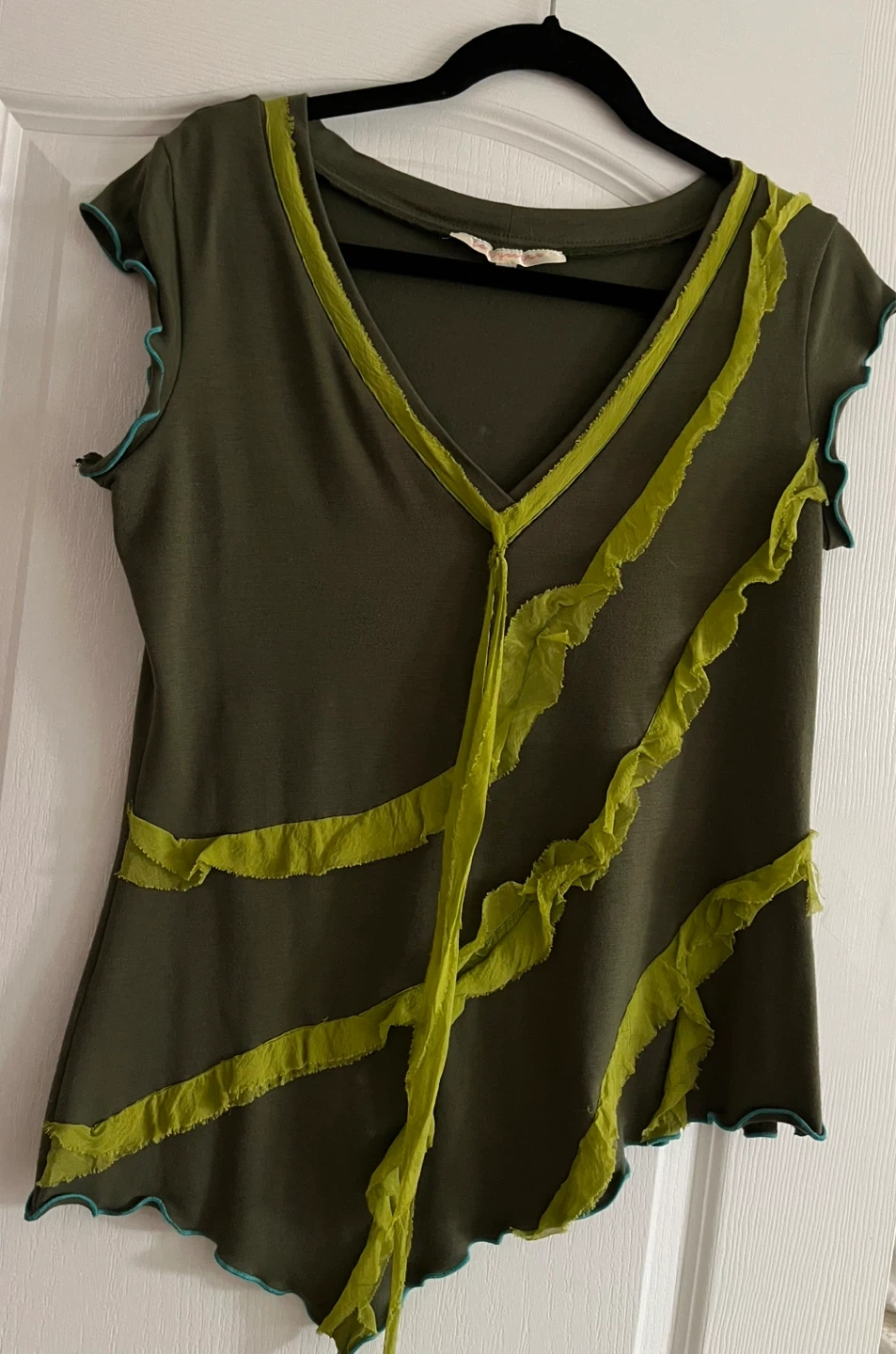 Olive green short-sleeved top from Bellydance Oasis. Features lime green ribbon detailing with a ruffled texture across the front. Size XL/TG.