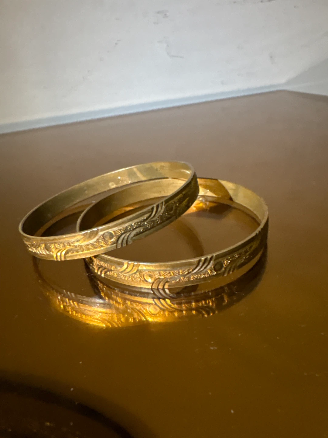 Selling a set of two gold-coloured bangle bracelets. They have a lovely patterned design on them. Perfect for adding a touch of elegance to any outfit!
