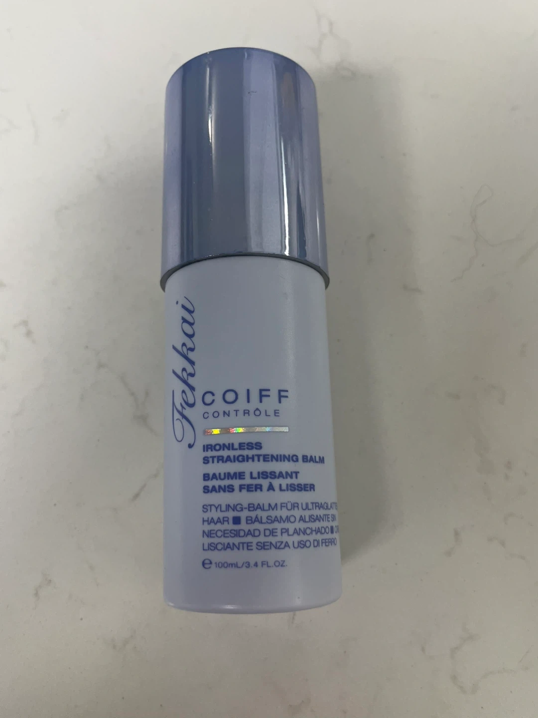 Fekkai Coiff Controle Ironless Straightening Balm. It's a styling balm for ultralight hair. 100ml / 3.4 fl. oz. It has ingredients like Water, Cetearyl Alcohol, and Shea Butter.
