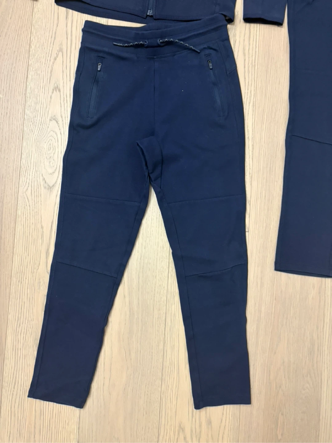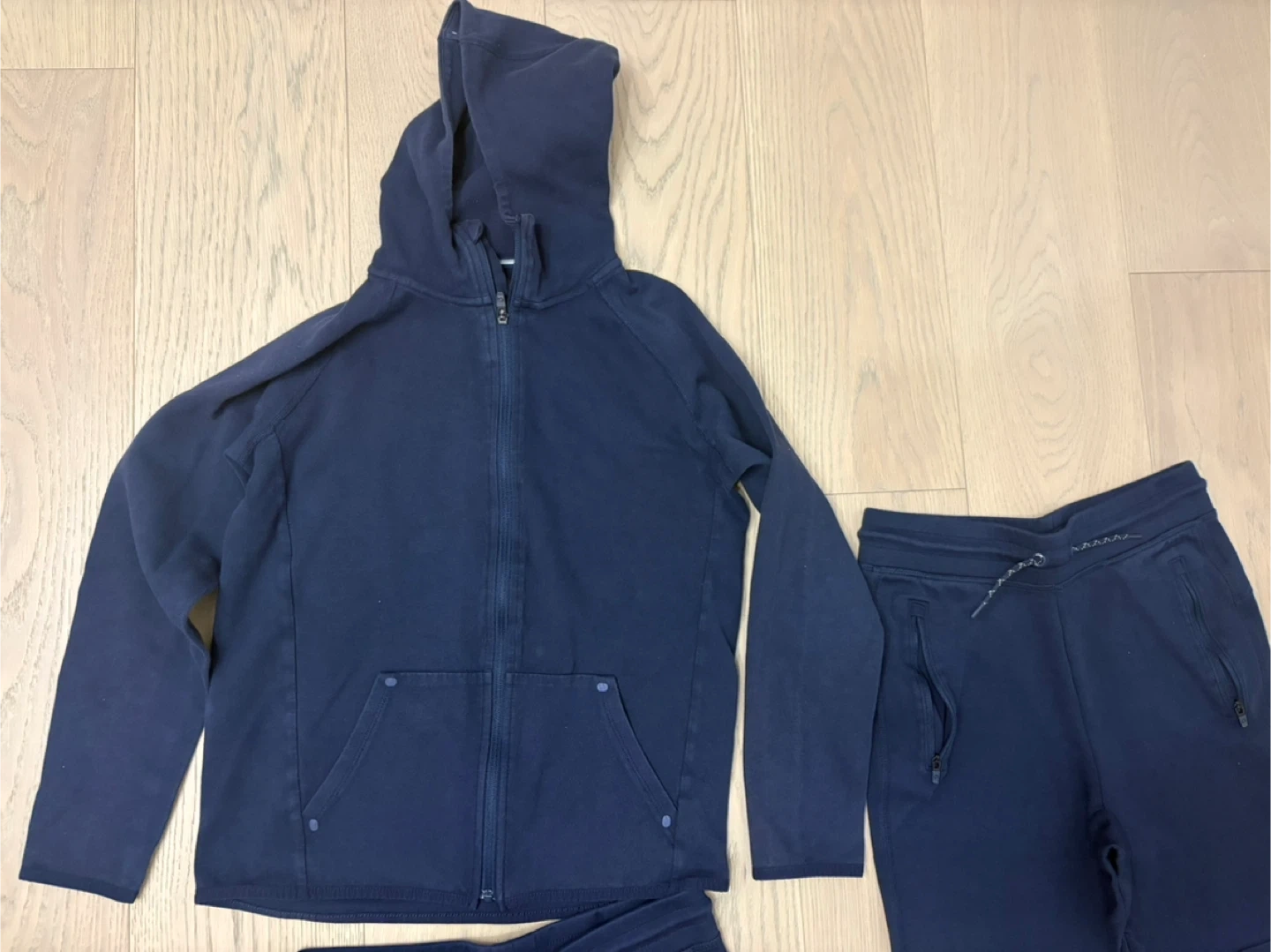 This GapFit tracksuit set includes a zip-up hoodie and two pairs of sweatpants in navy blue. The hoodie has a full zip closure and front pockets. Sweatpants feature an elastic waistband with a drawstring and zippered pockets.