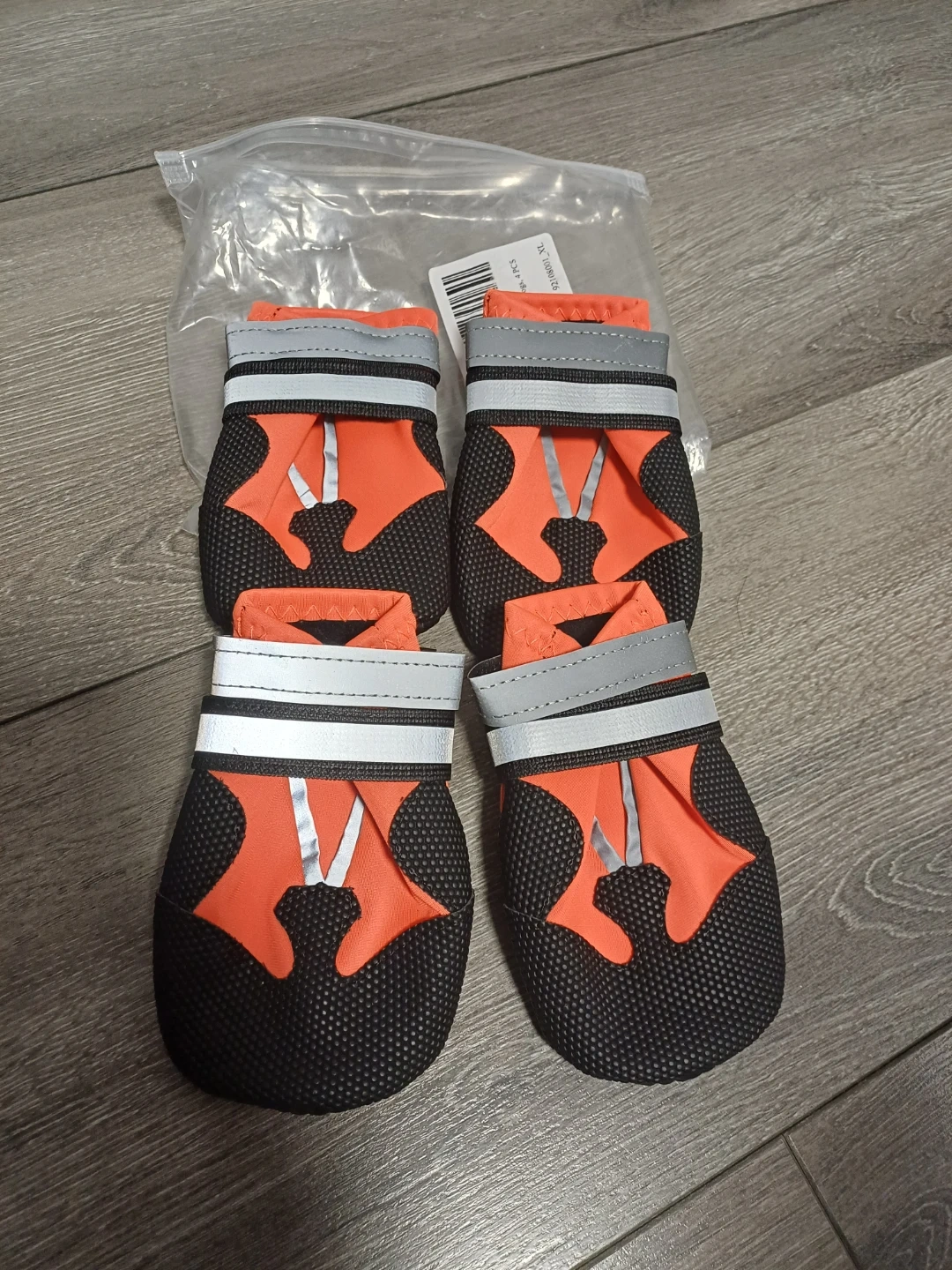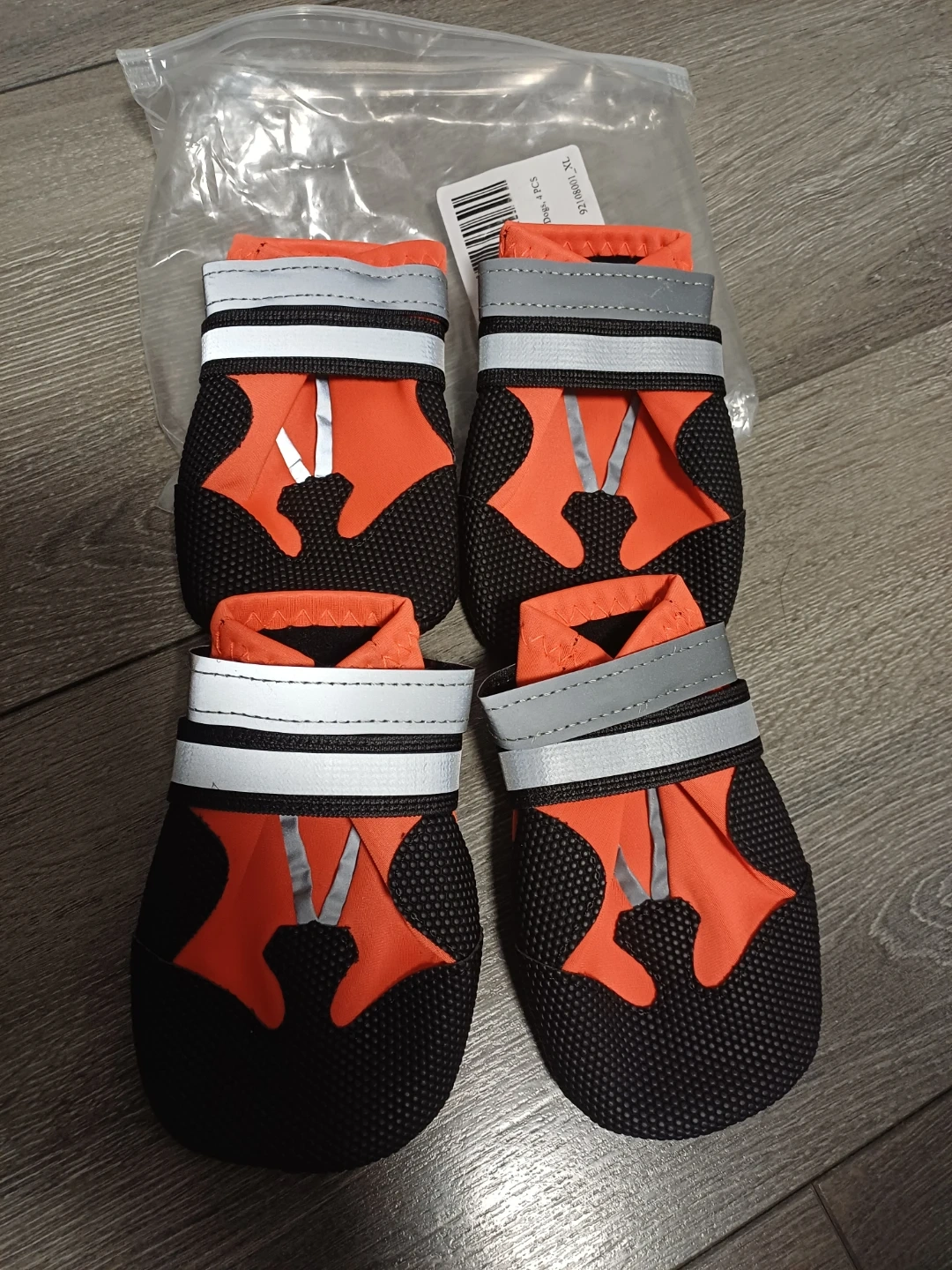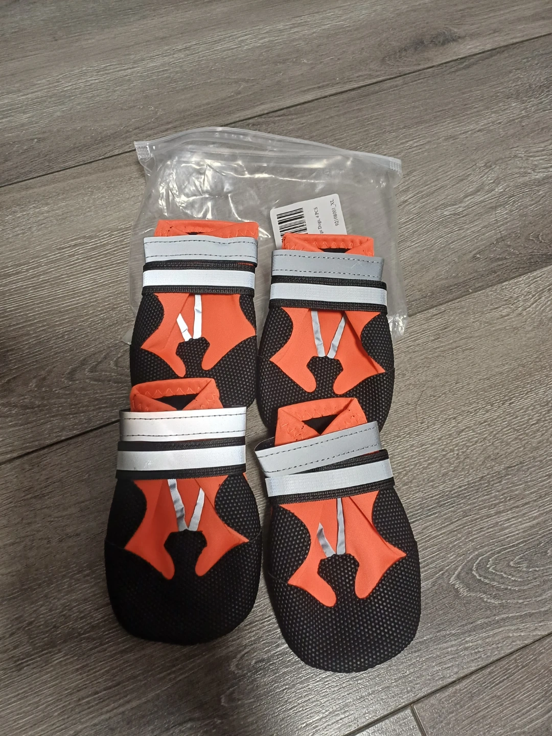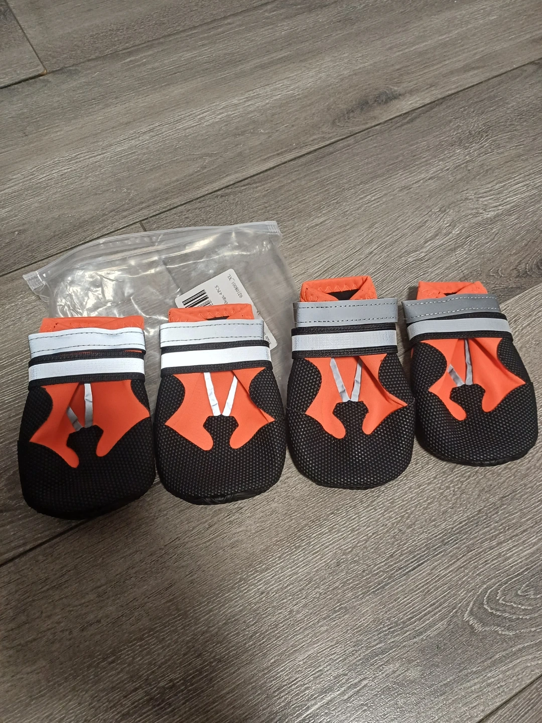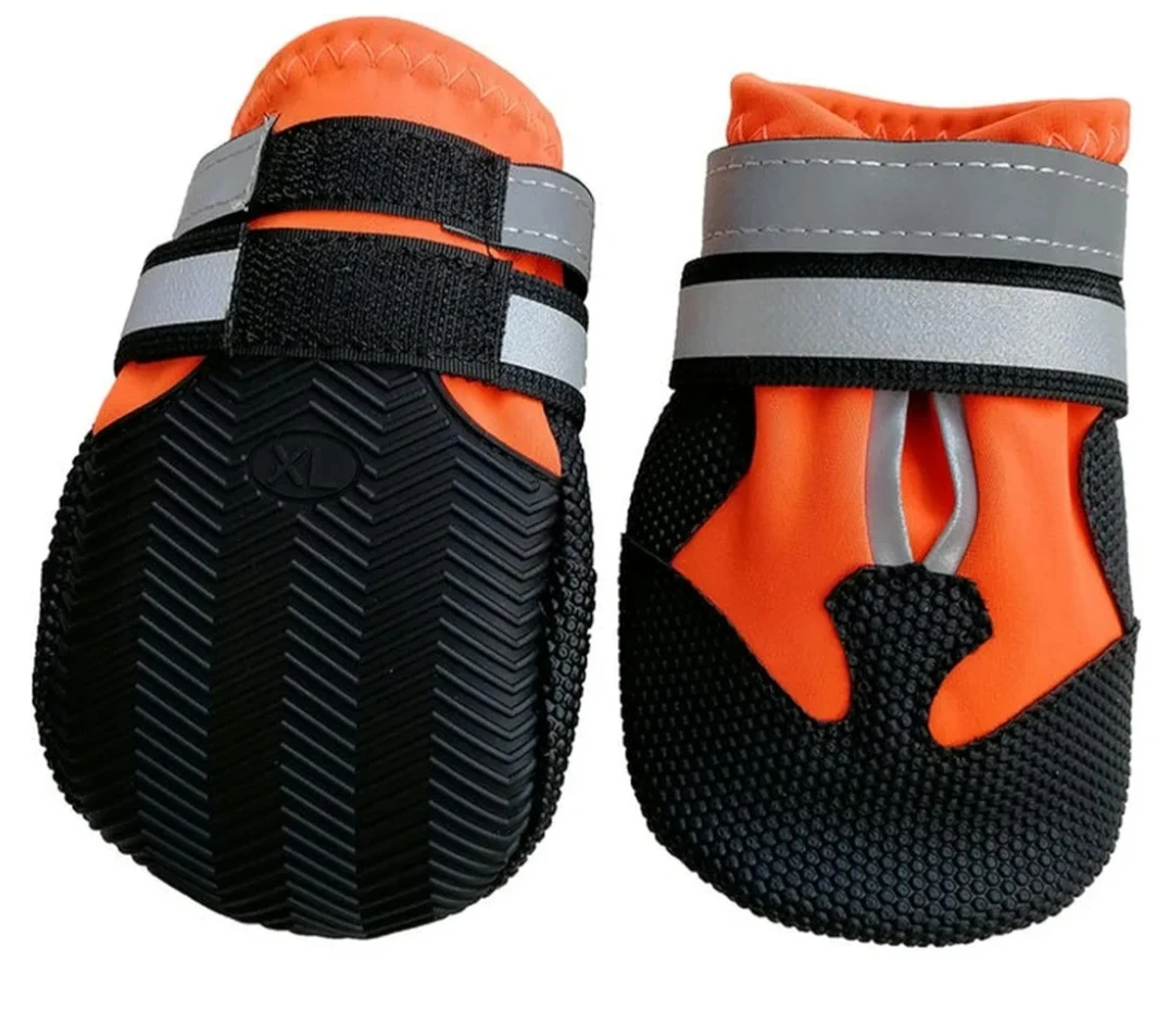 These brand new water proof dog boots comes in a set of four and are size XL. They're orange and black with reflective strips and adjustable straps. The soles are black with a textured grip pattern.