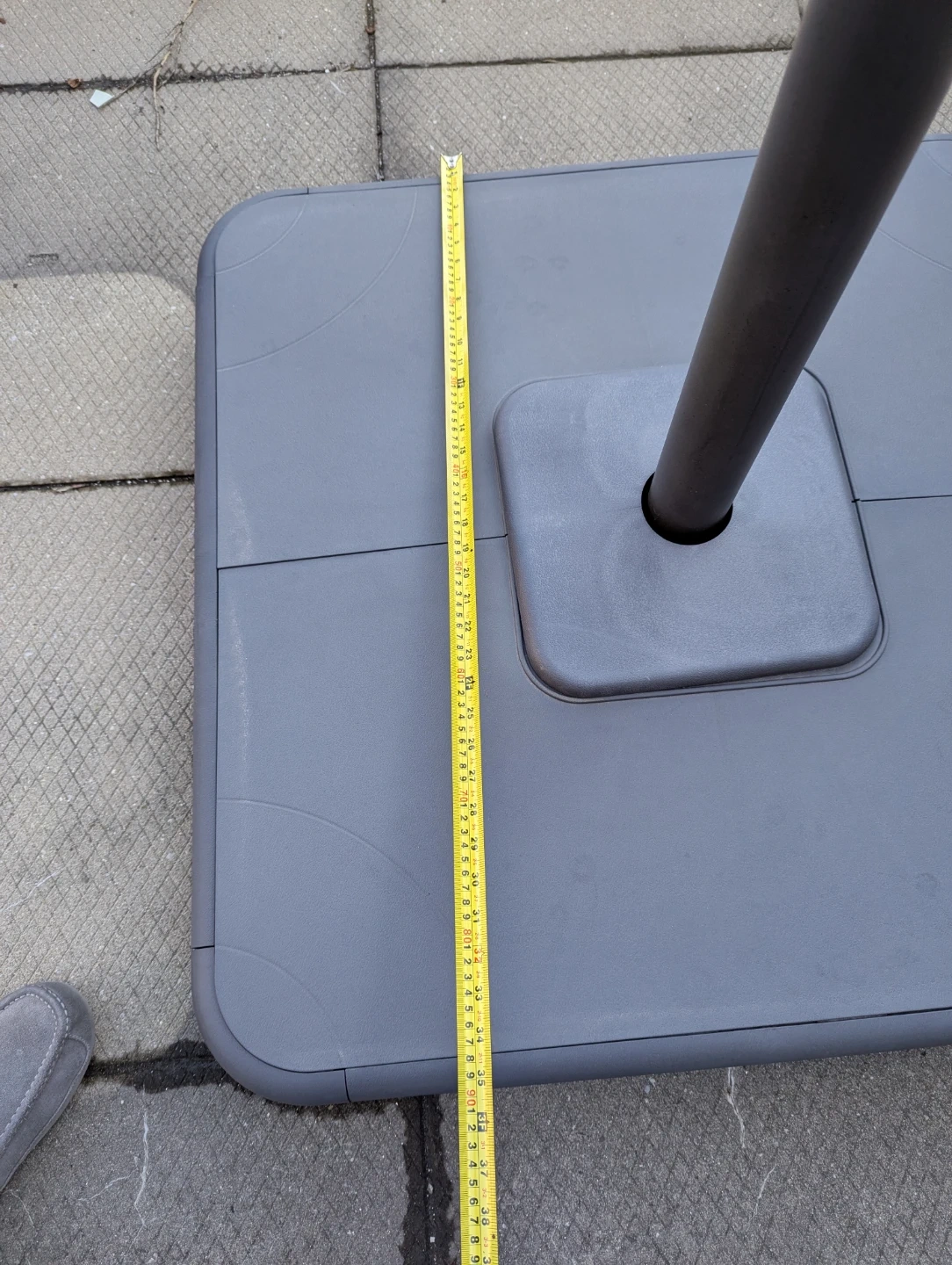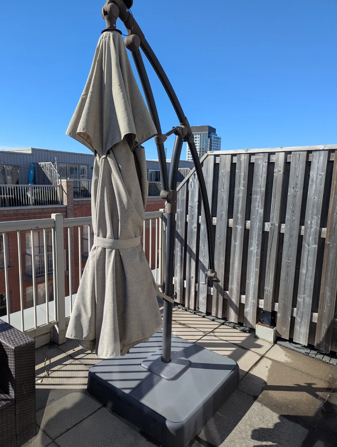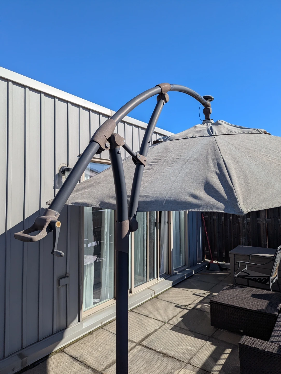 Grey cantilever patio umbrella with a dark grey base. It features a crank mechanism for easy opening and closing. Umbrella fabric is a durable polyester.