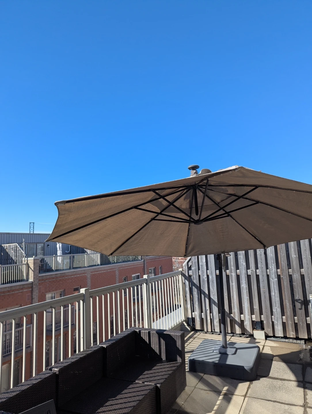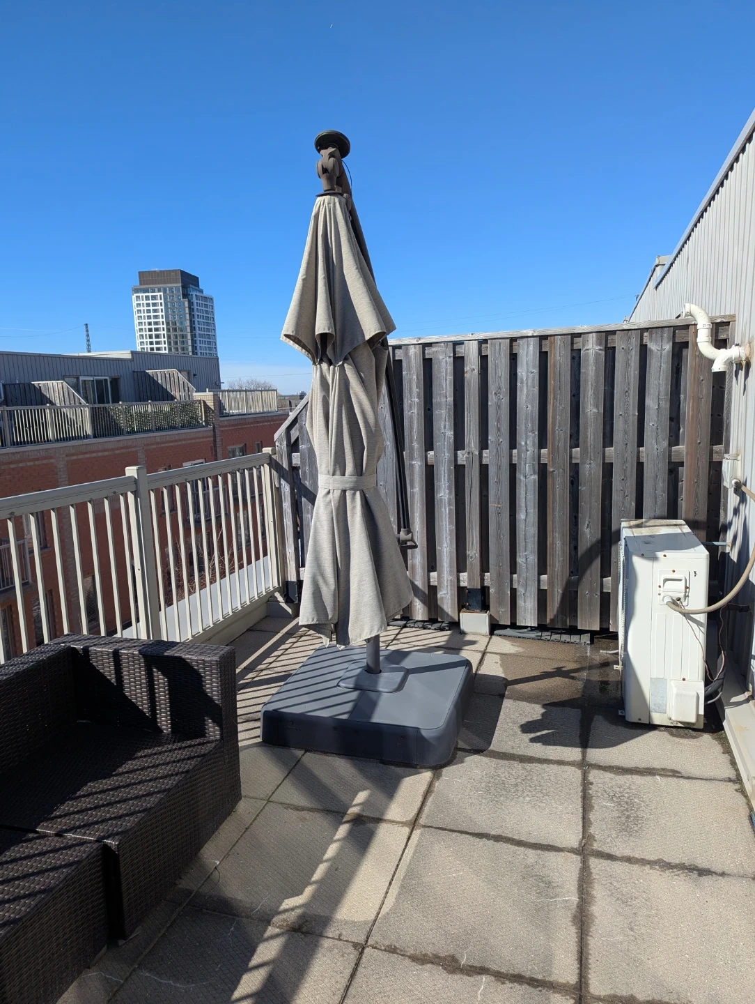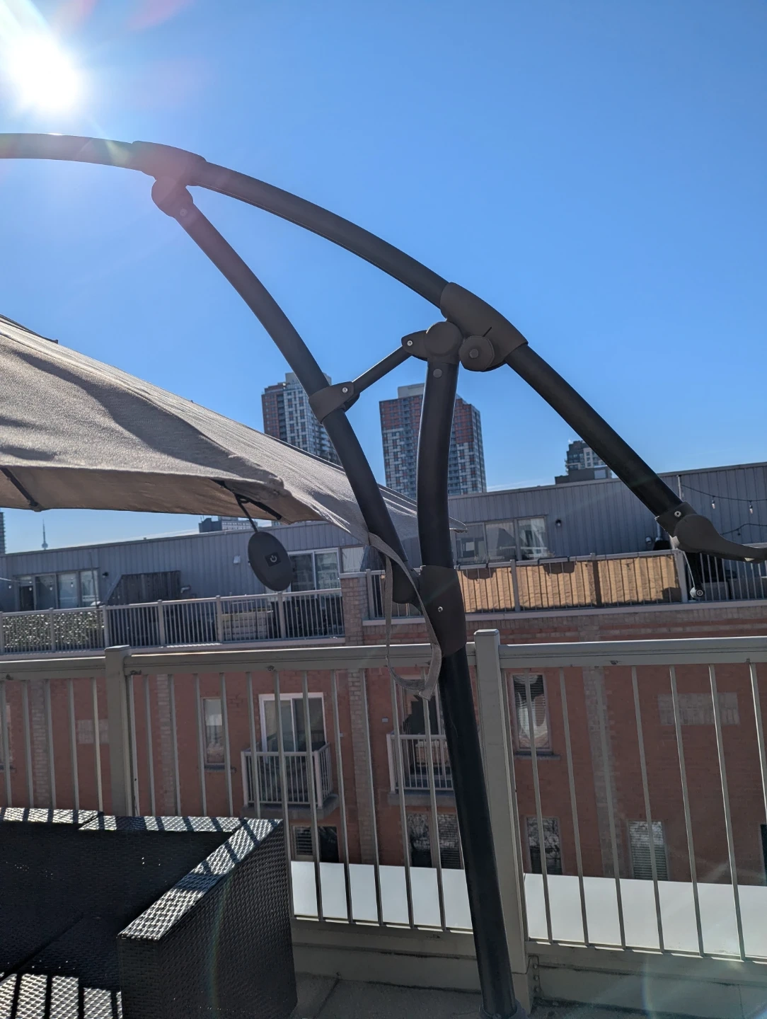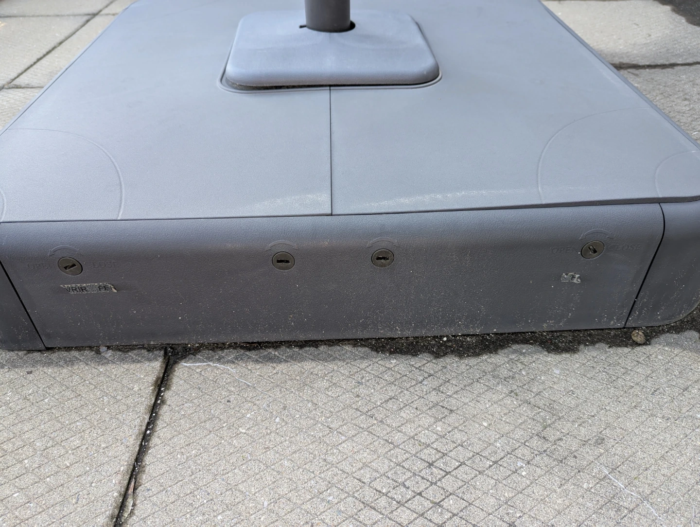 Grey cantilever patio umbrella with a dark grey base. It features a crank mechanism for easy opening and closing. Umbrella fabric is a durable polyester.