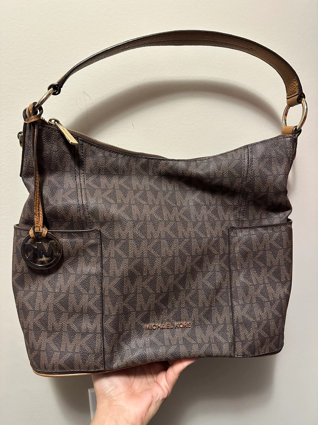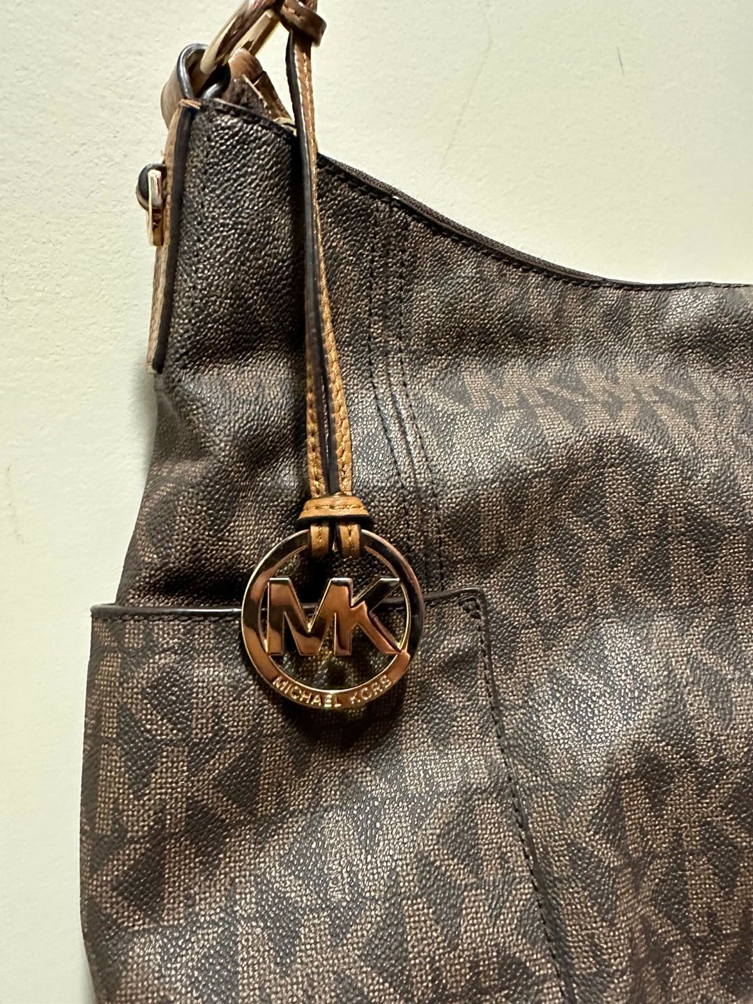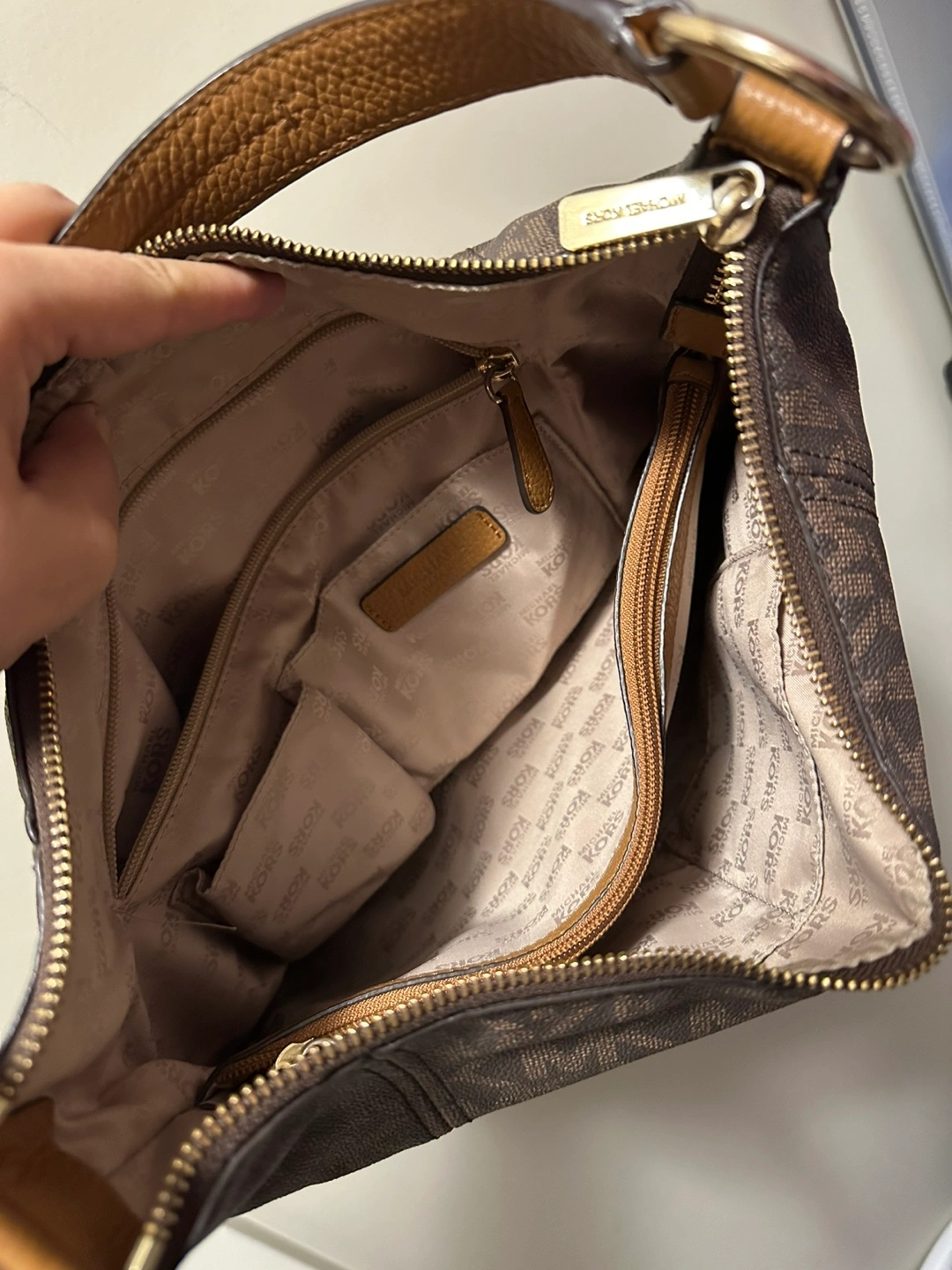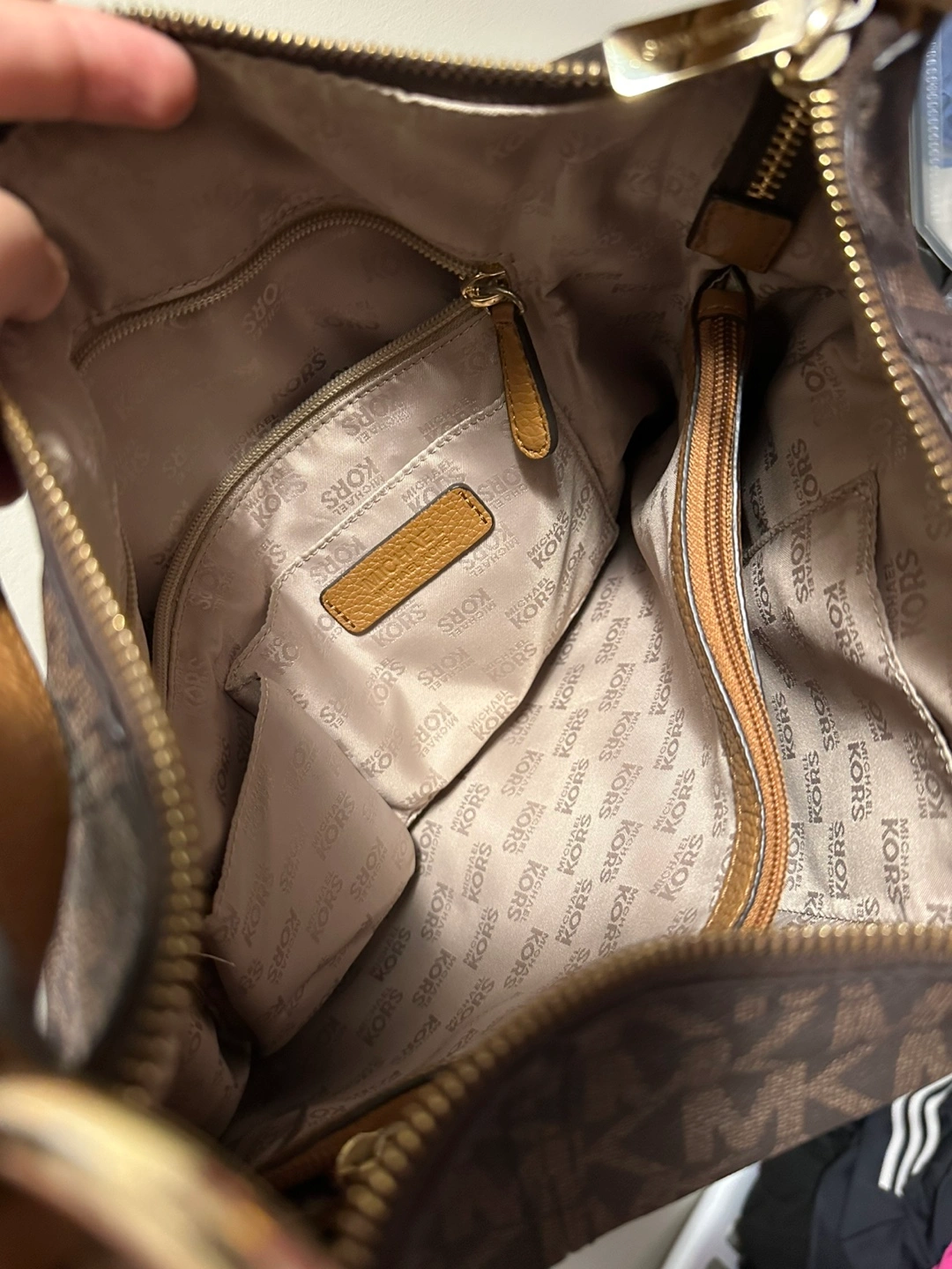 Brown canvas tote bag with gold hardware. Interior features a zippered pocket, a slip pocket, and two open pockets. Includes a leather charm.