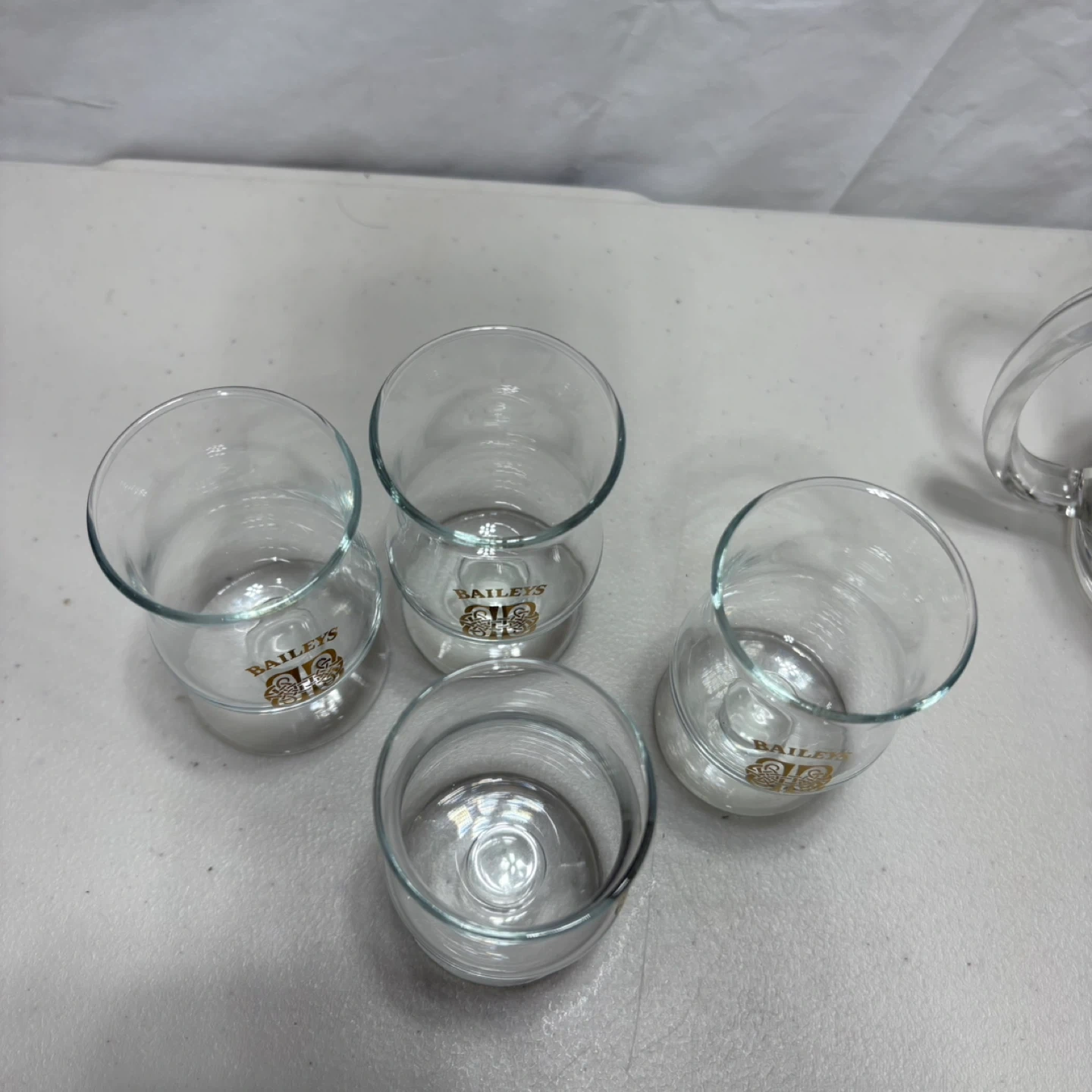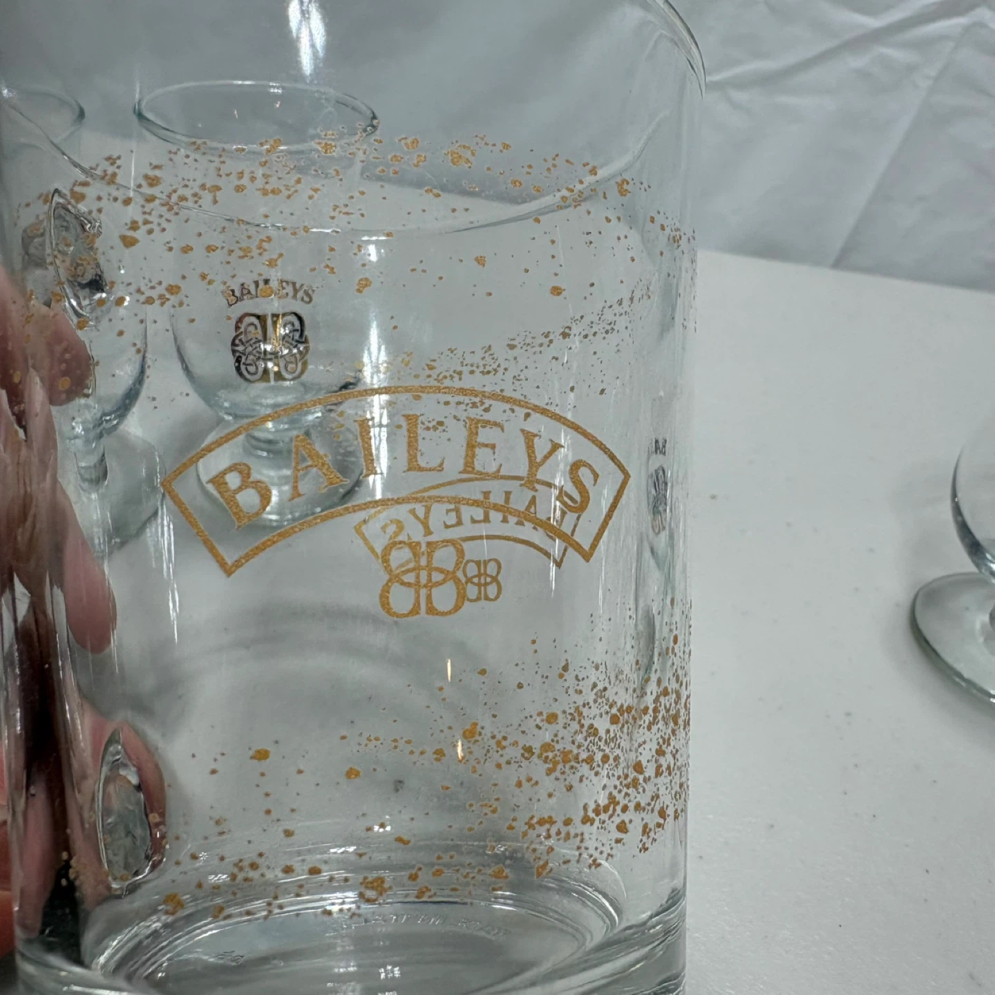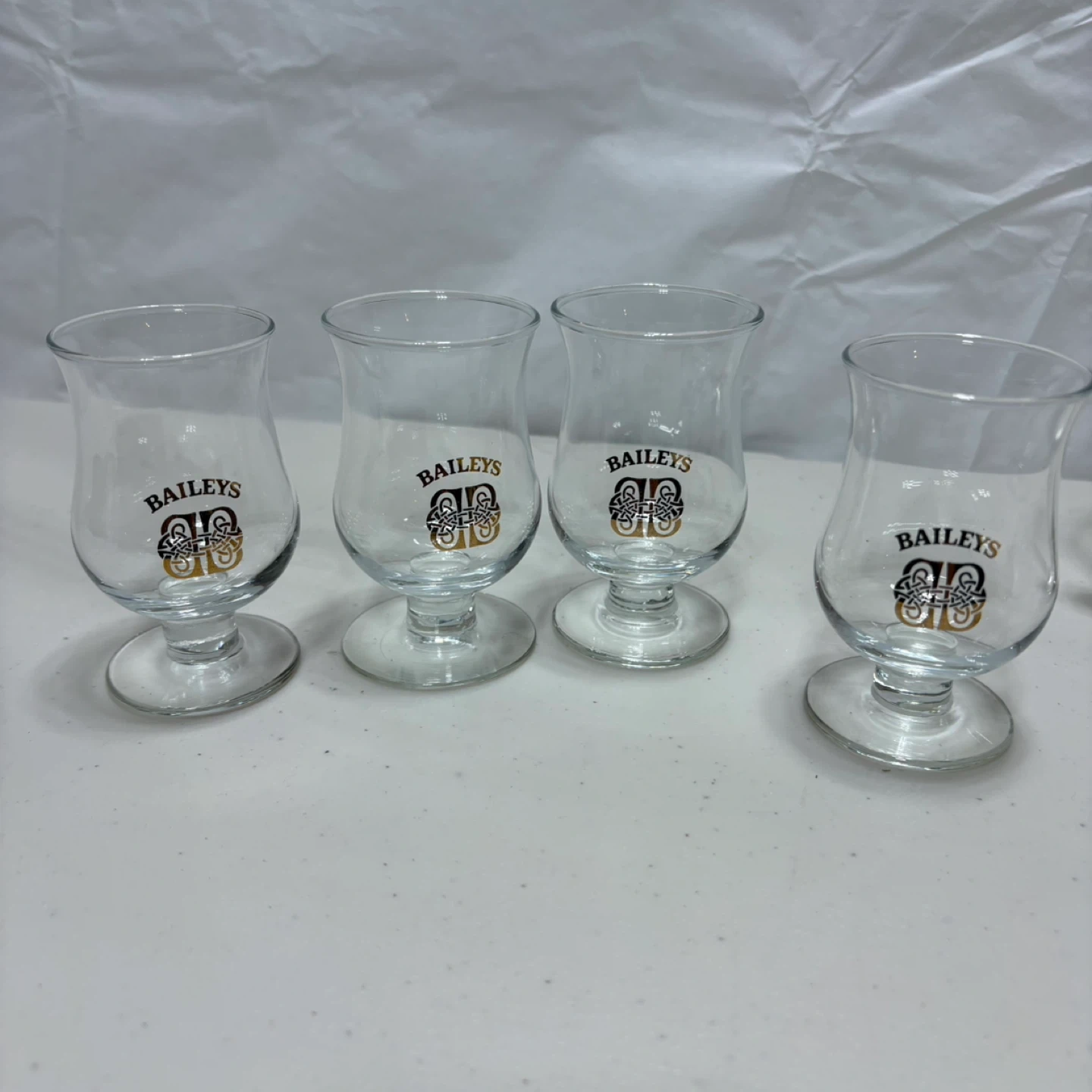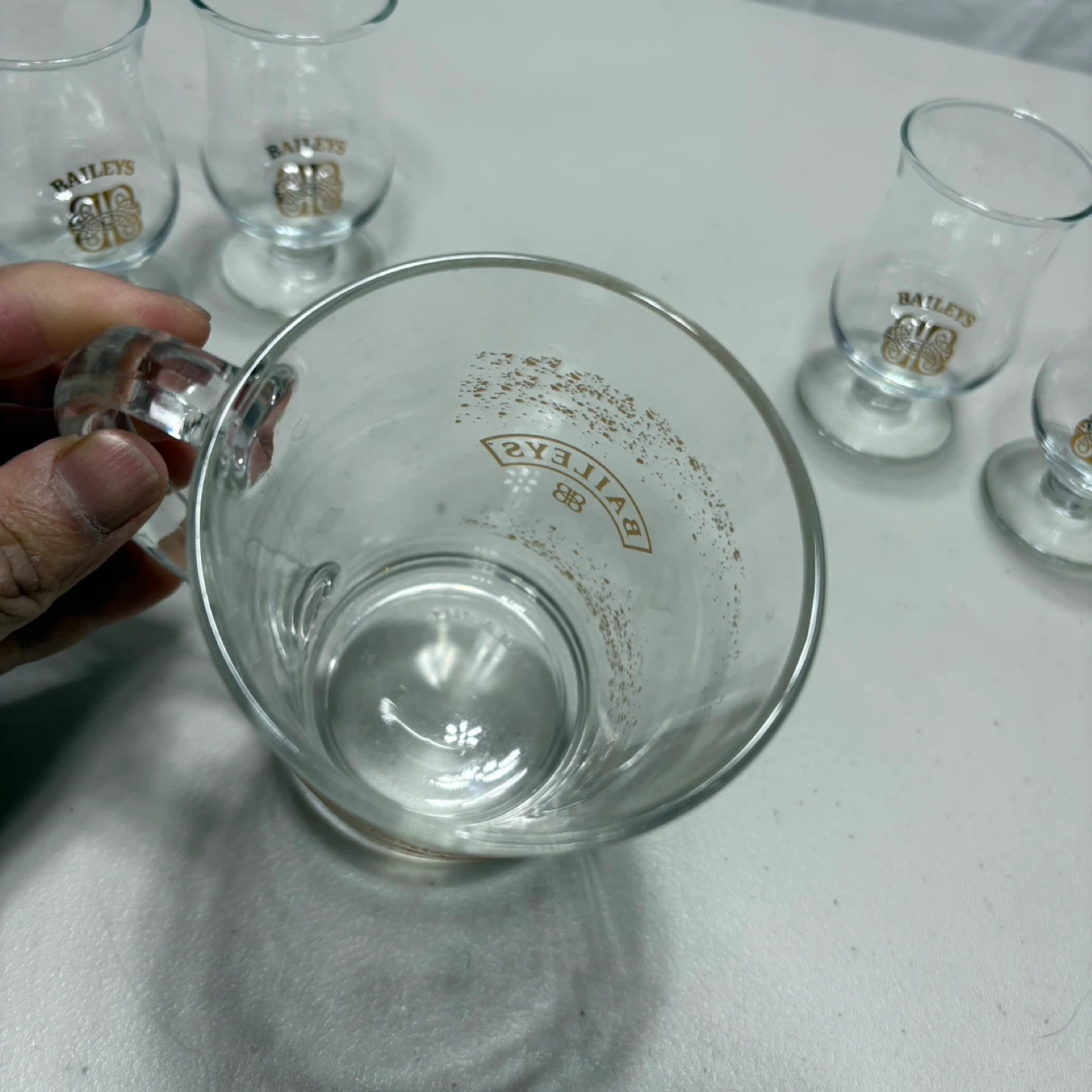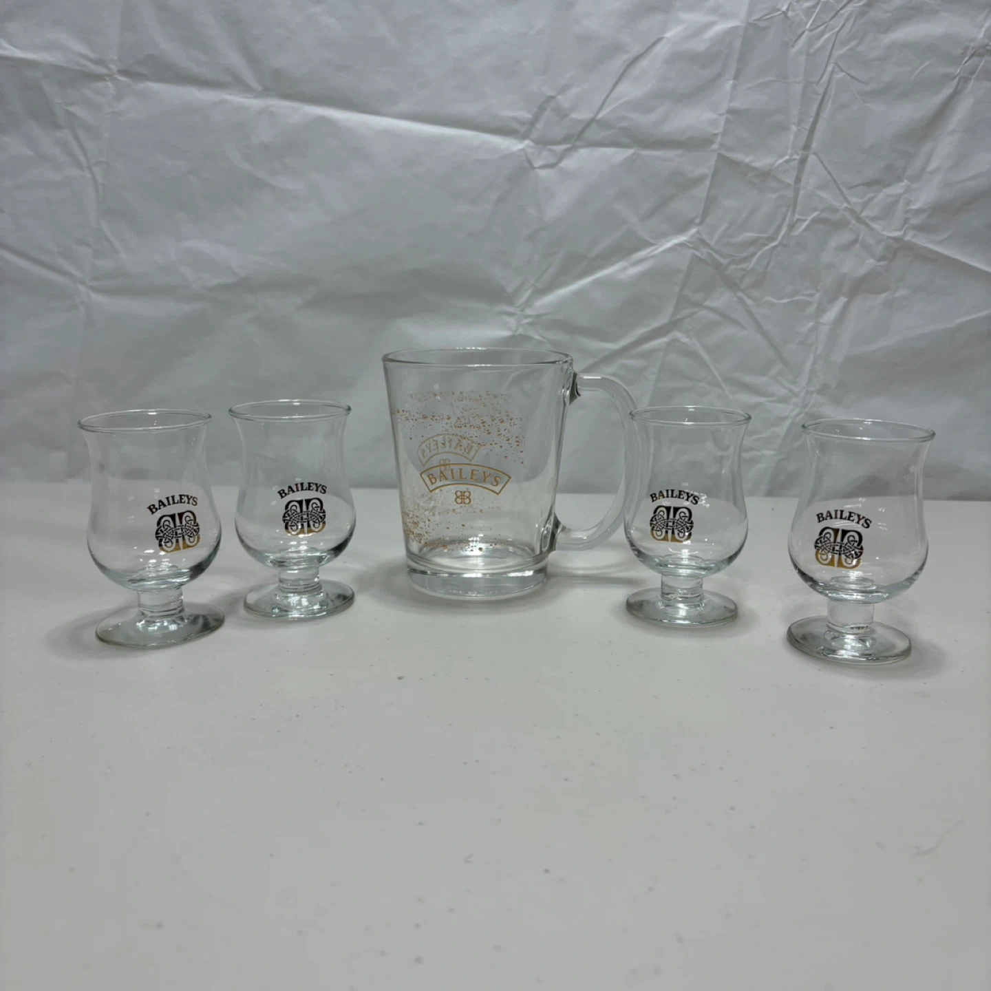 A set of five Baileys branded glasses, including one mug and four small stemmed glasses. They're clear glass with the gold Baileys logo and decorative speckles. These are great for enjoying your favourite liqueurs!