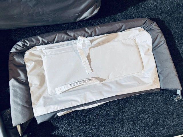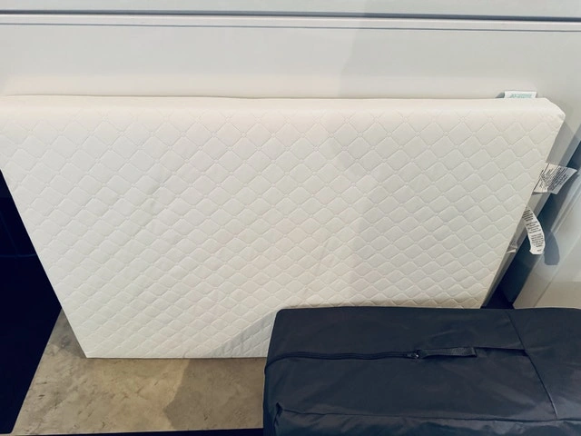 Used playard / nursery center with mattress and bed sheet. It was only used at home very carefully. There is a small hole in the lower part of the changing mat, only visible from below (see photo).