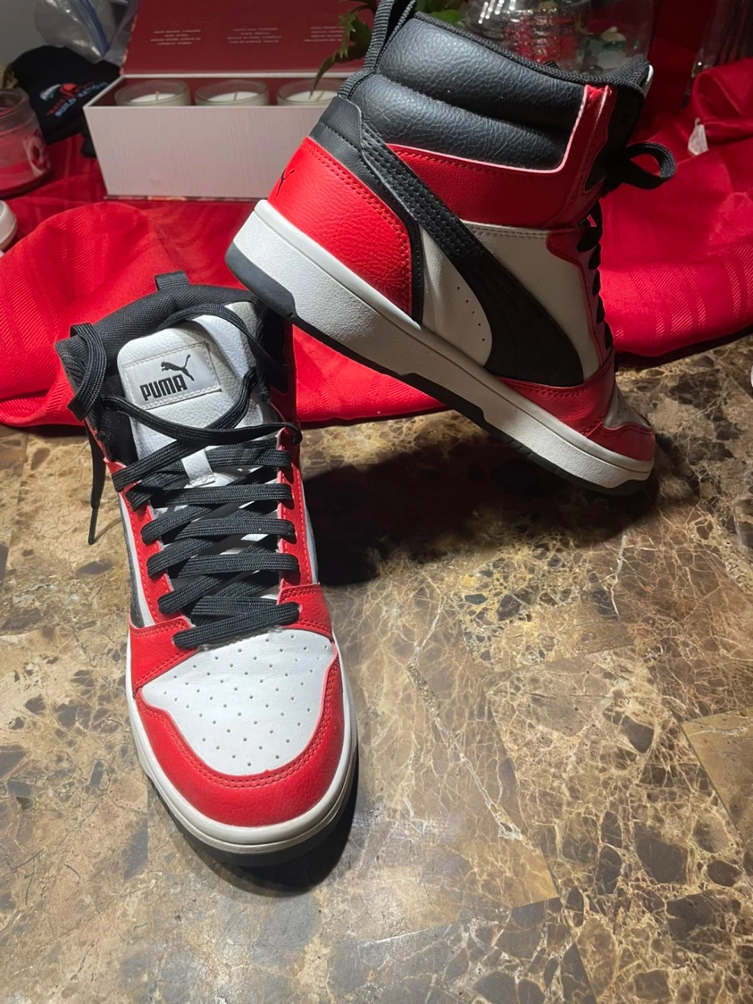 Puma high-top sneakers in a bold red, white, and black colourway. These kicks are size US 6, EUR 38, and UK 5. They're made in China with a synthetic and leather upper.