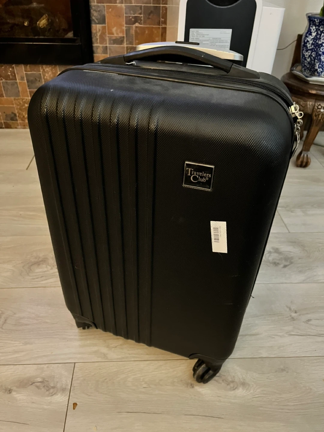 This is a black hardside carry-on suitcase from Travelers Club. It's made of durable material and has a telescoping handle for easy maneuvering. The interior is lined and features a zippered compartment.