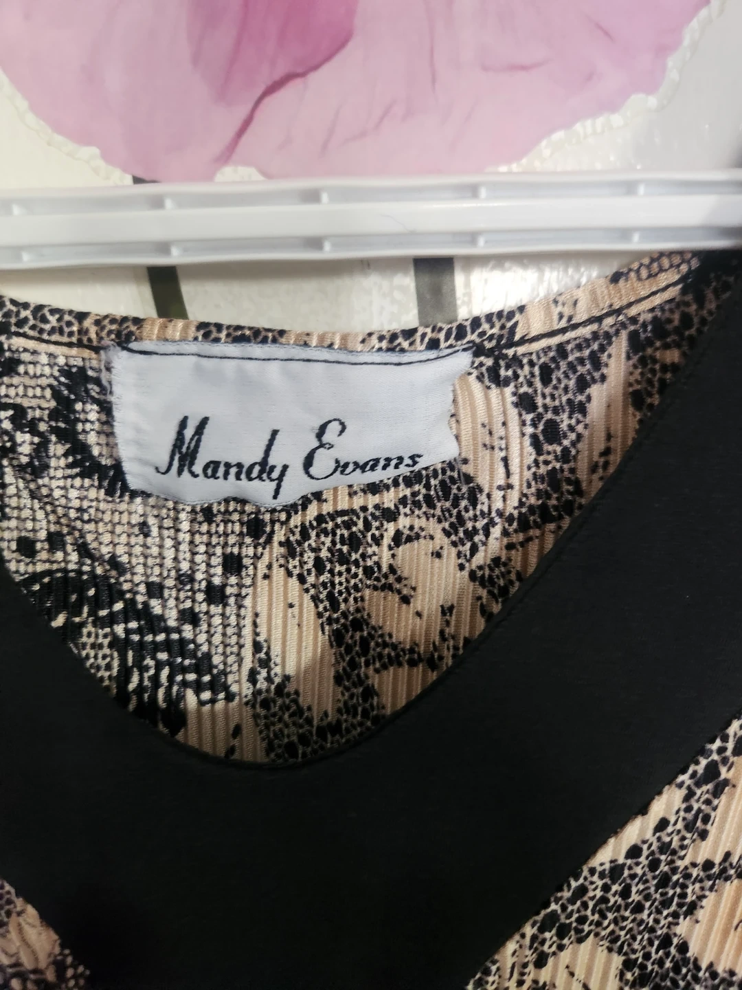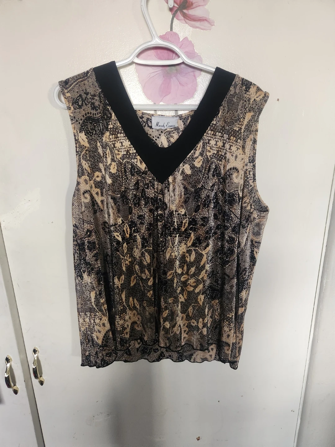 This Mandy & Evans sleeveless top has a V-neck with a black trim. It's made with a textured, patterned fabric in beige and black. Perfect for dressing up or down!