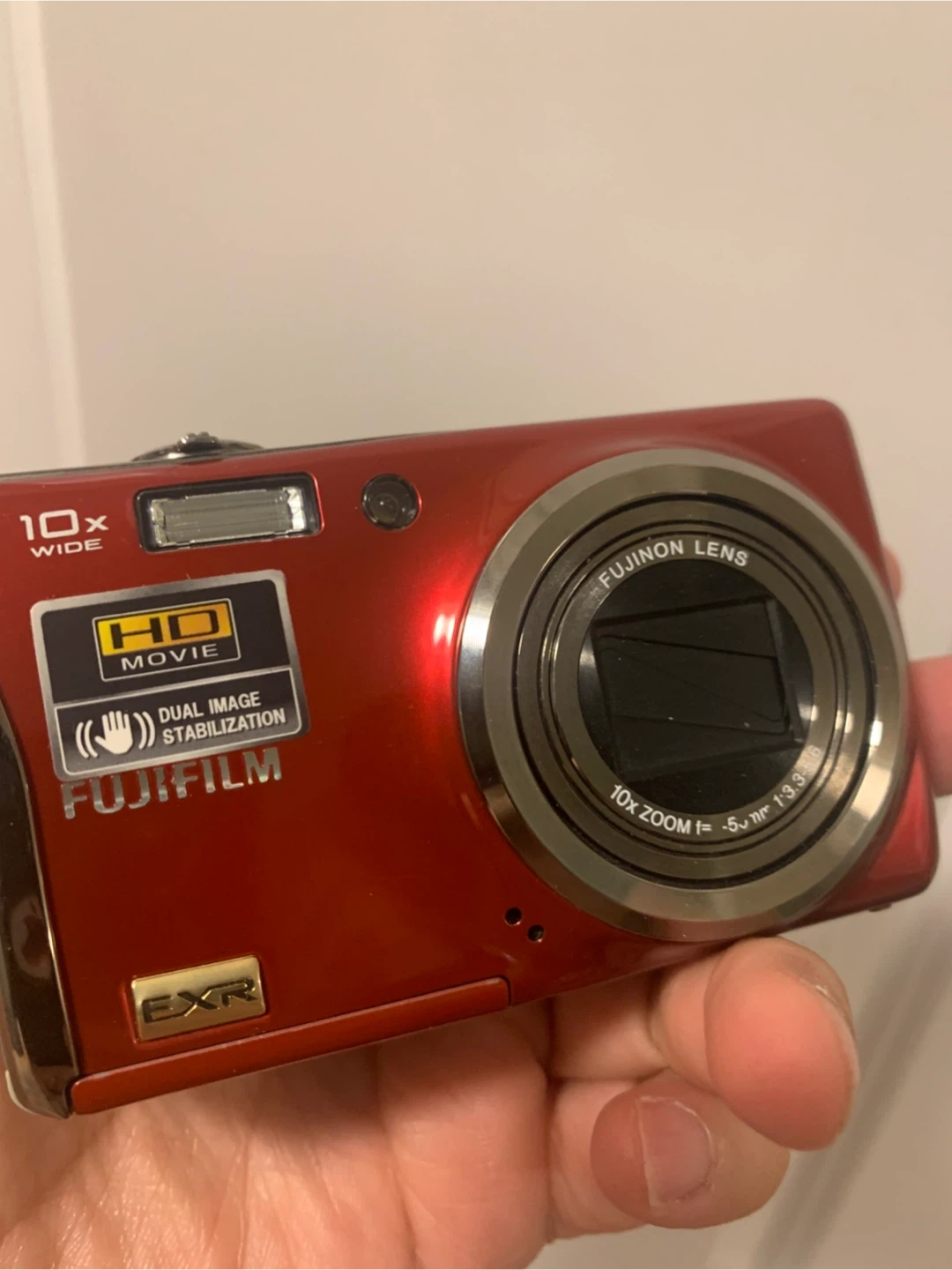 This is a red Fujifilm FinePix F80 EXR digital camera. It features 10x wide optical zoom and dual image stabilization. HD movie recording is supported.