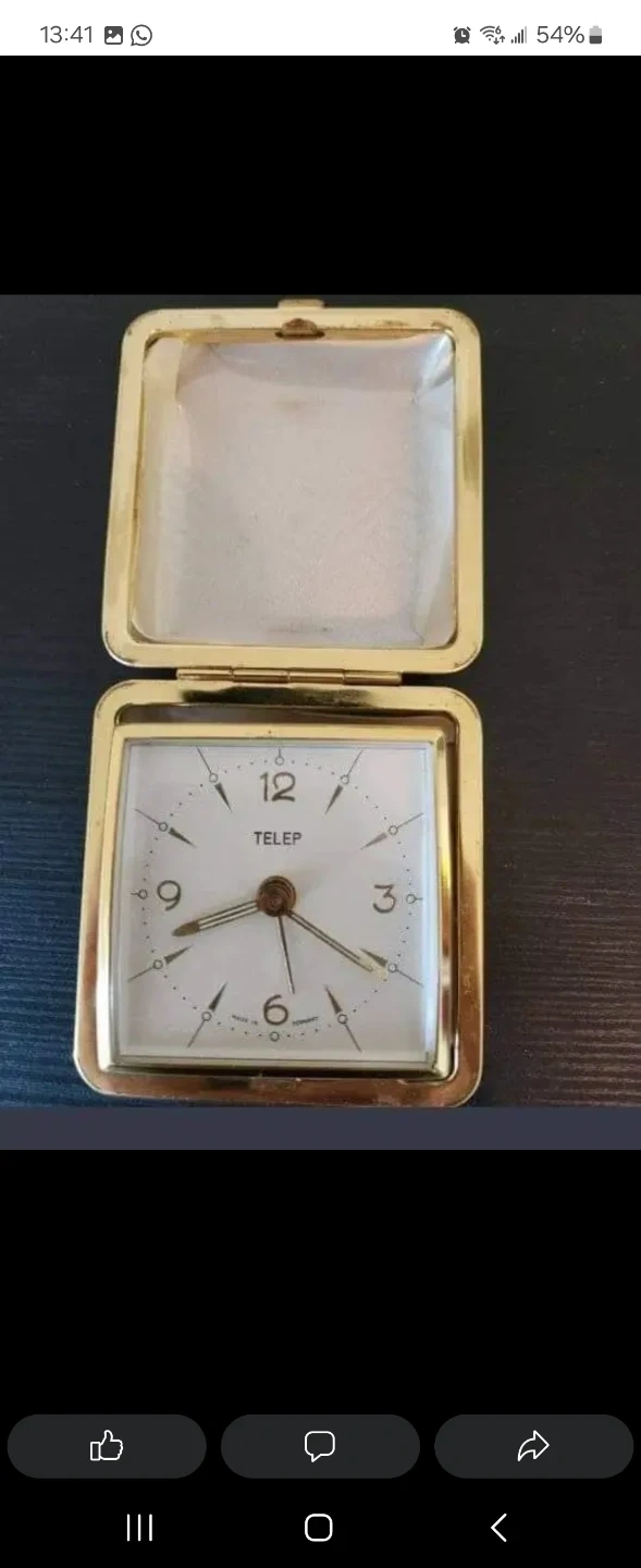 This is a vintage TELEP travel alarm clock. It's made in Germany and features a classic white face with gold-tone hands. It's a compact, folding design perfect for travel.