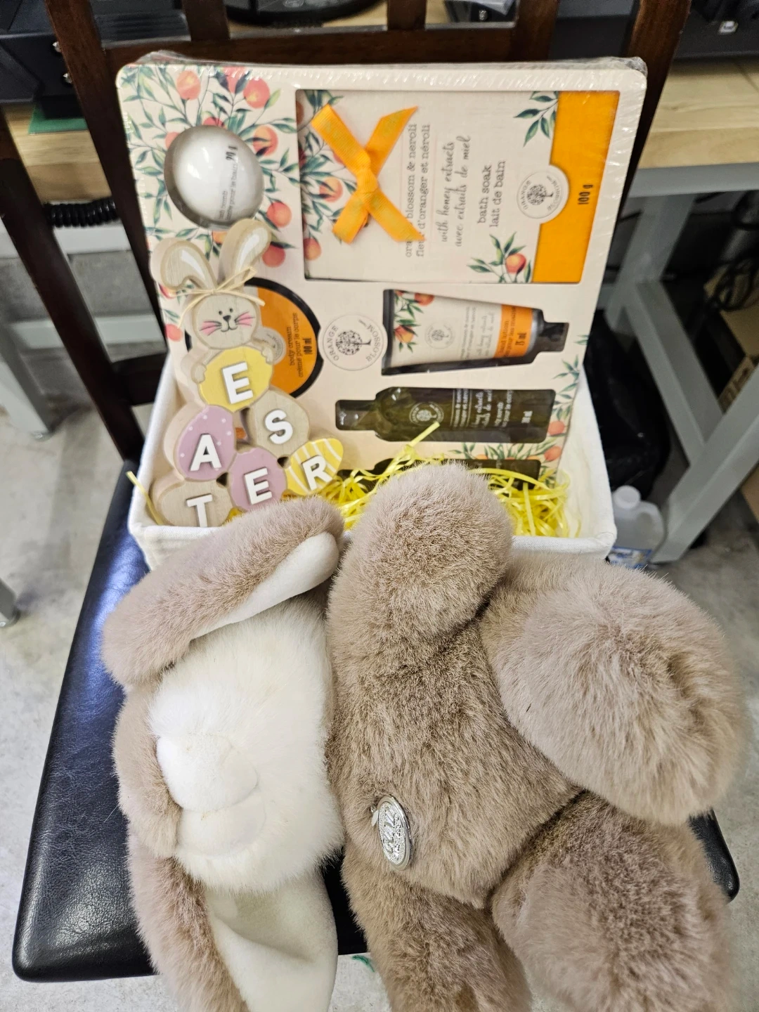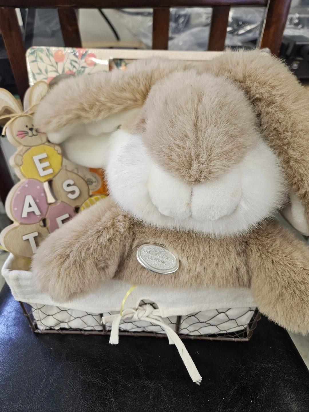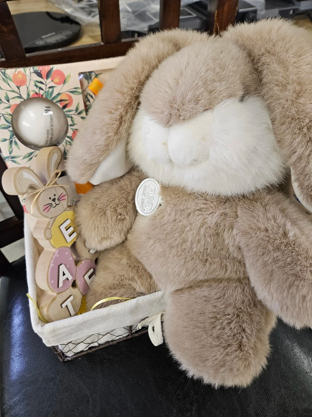 This cute Easter gift basket features a plush bunny from GUND. It's filled with bath soak and hand cream, perfect for a relaxing treat.