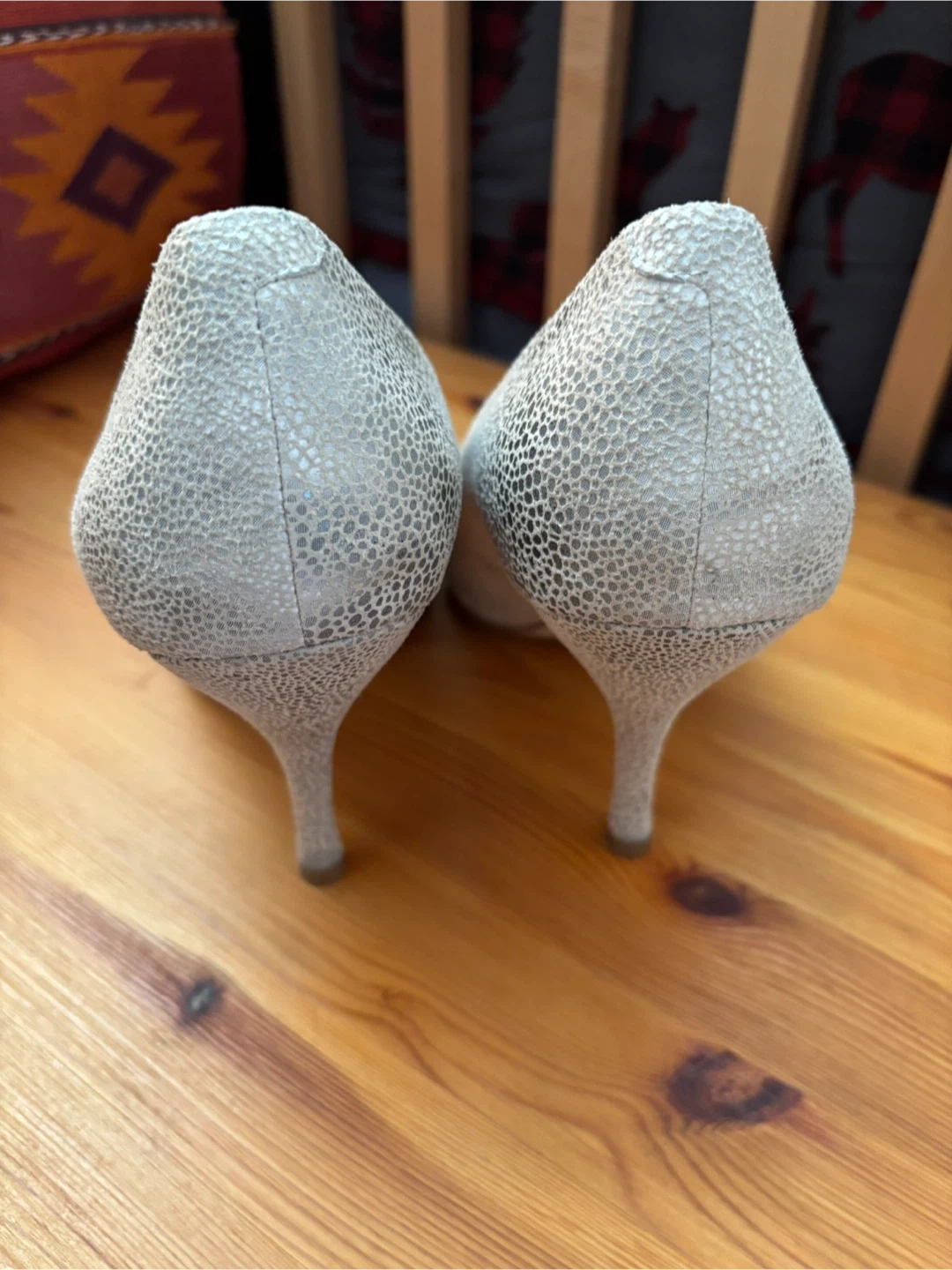 Stylish BCBGeneration heels with a textured, light-coloured finish. These peep-toe shoes are perfect for adding a touch of flair to any outfit.