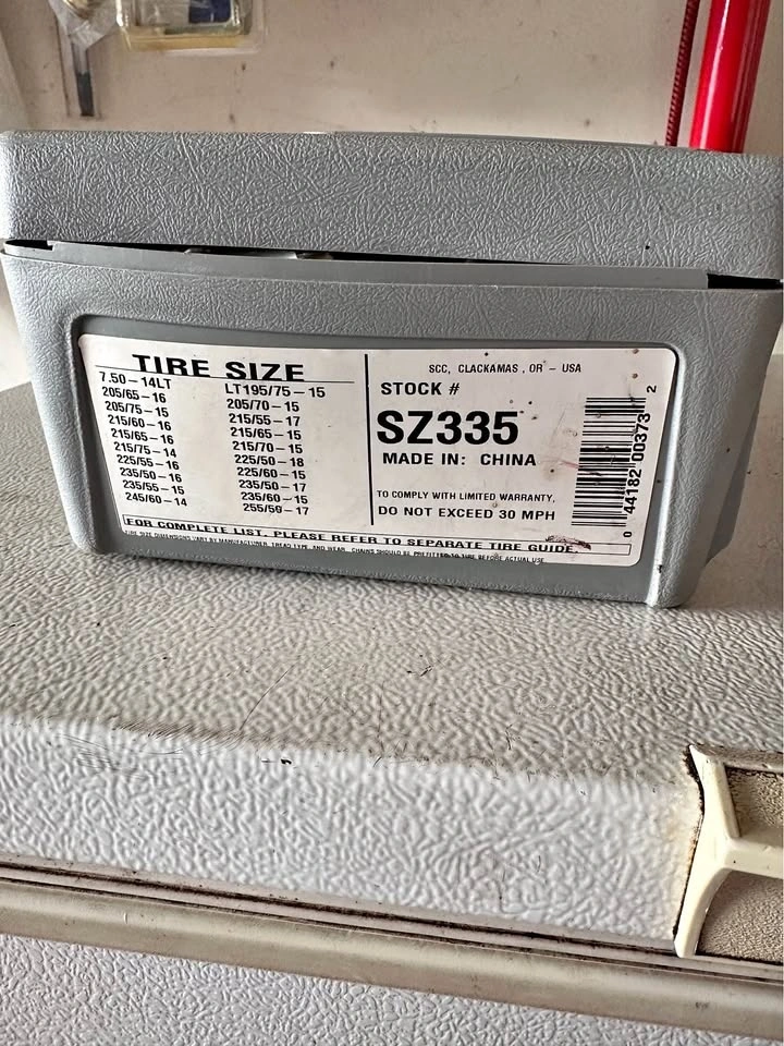 Car chains never used. Fits tires 15” to 17”. All sizes listed in one of the pictures. For car or SUV. Easy to put on. Get ready for the slopes and don’t get stuck in the parking lot again.