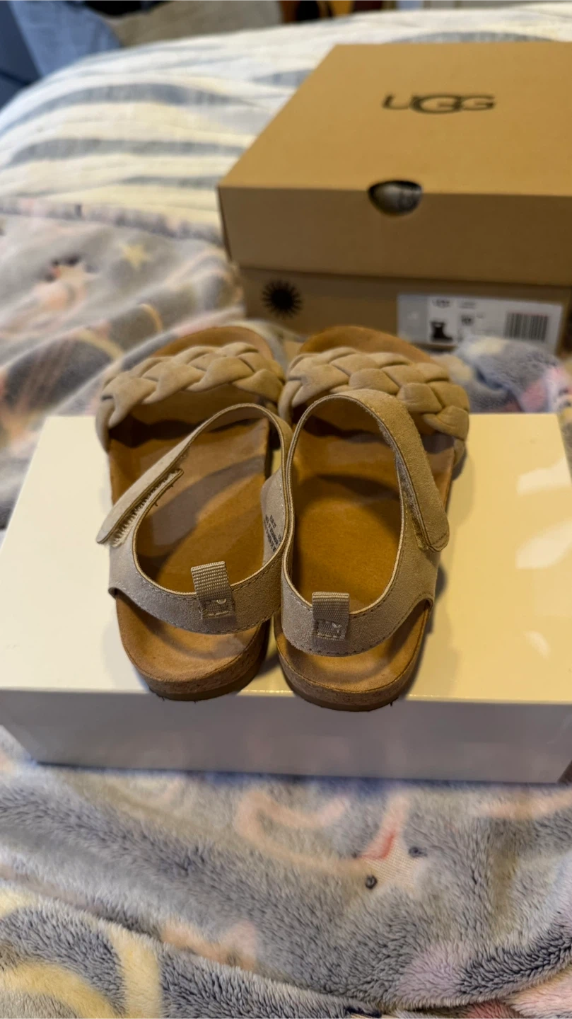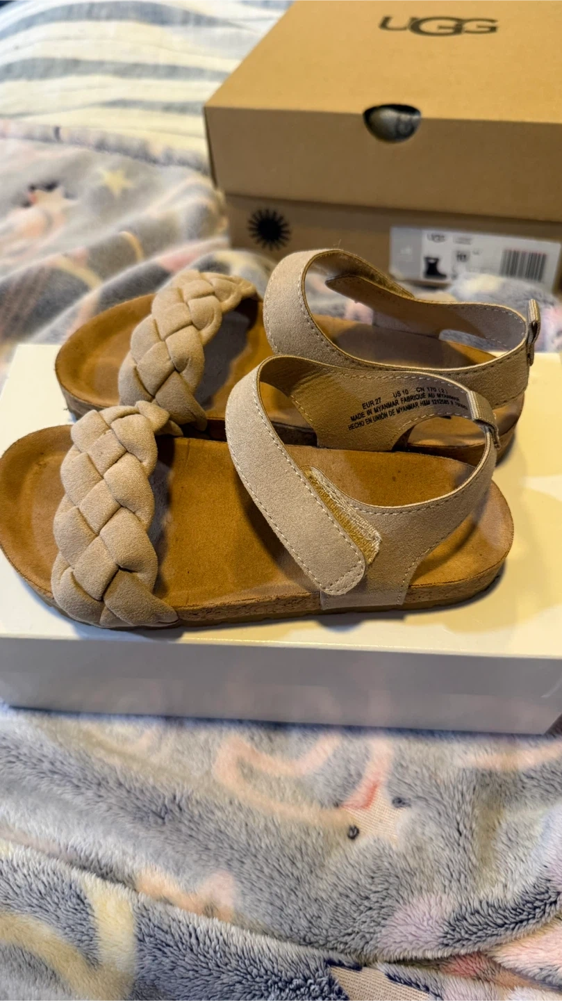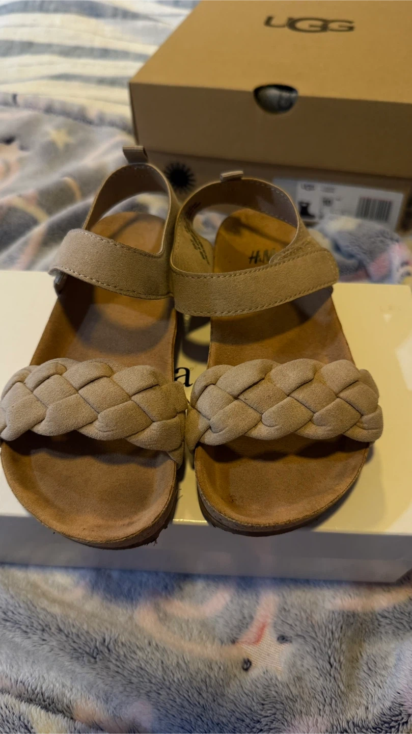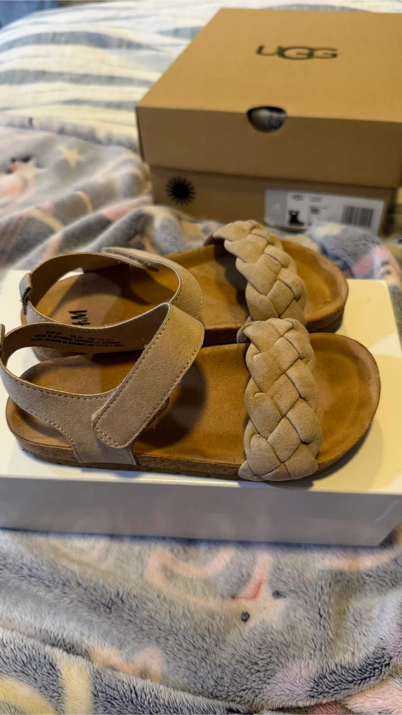 H&M kids' sandals in a neutral beige colour. They feature a cute braided strap design across the toes and adjustable velcro straps for a secure fit.