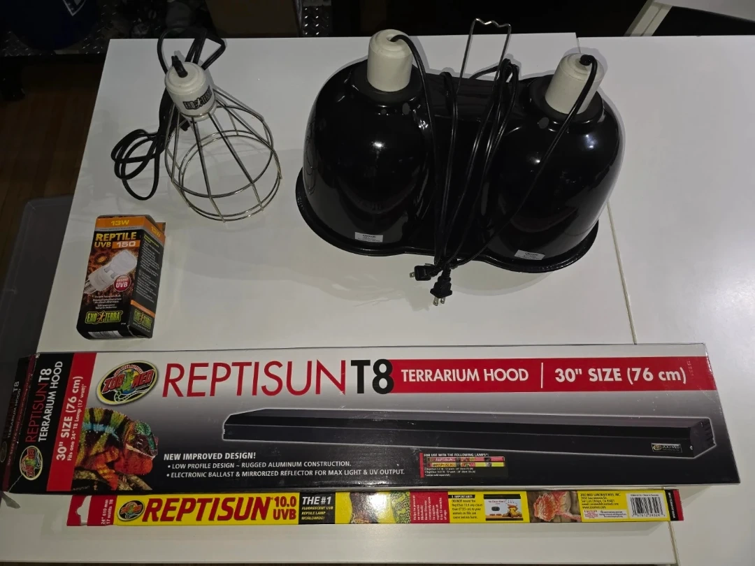 30 inch T8 UVB ZooMed Reptisun fixture and Shadedweller bulb (UVB output in photos meeting Ferguson Zone 1). It's designed for reptile terrariums and includes a low-profile design with a mirrored reflector for optimal light and UV output.- $25