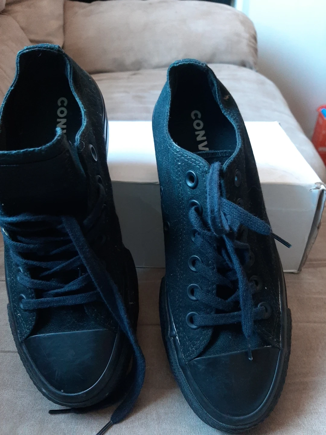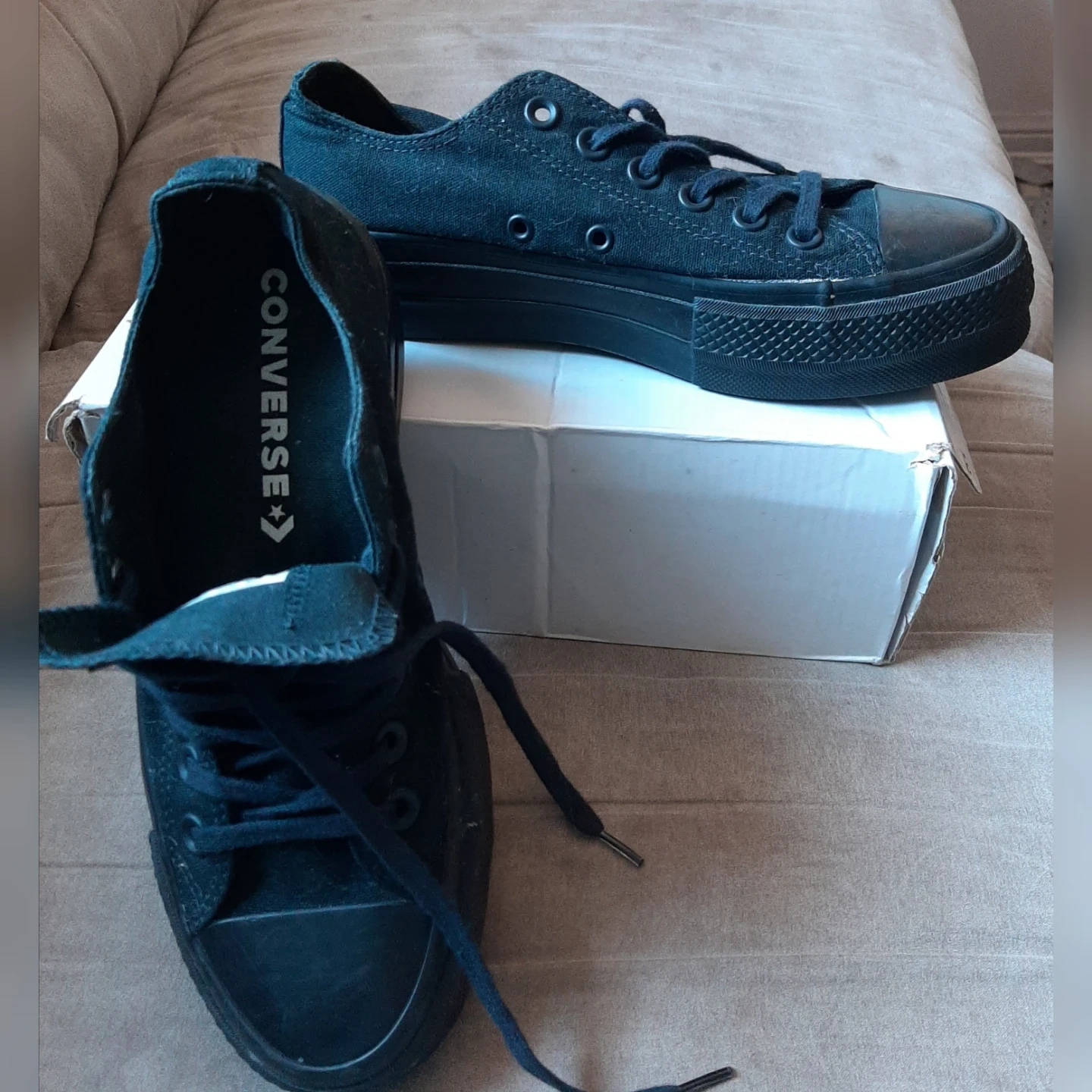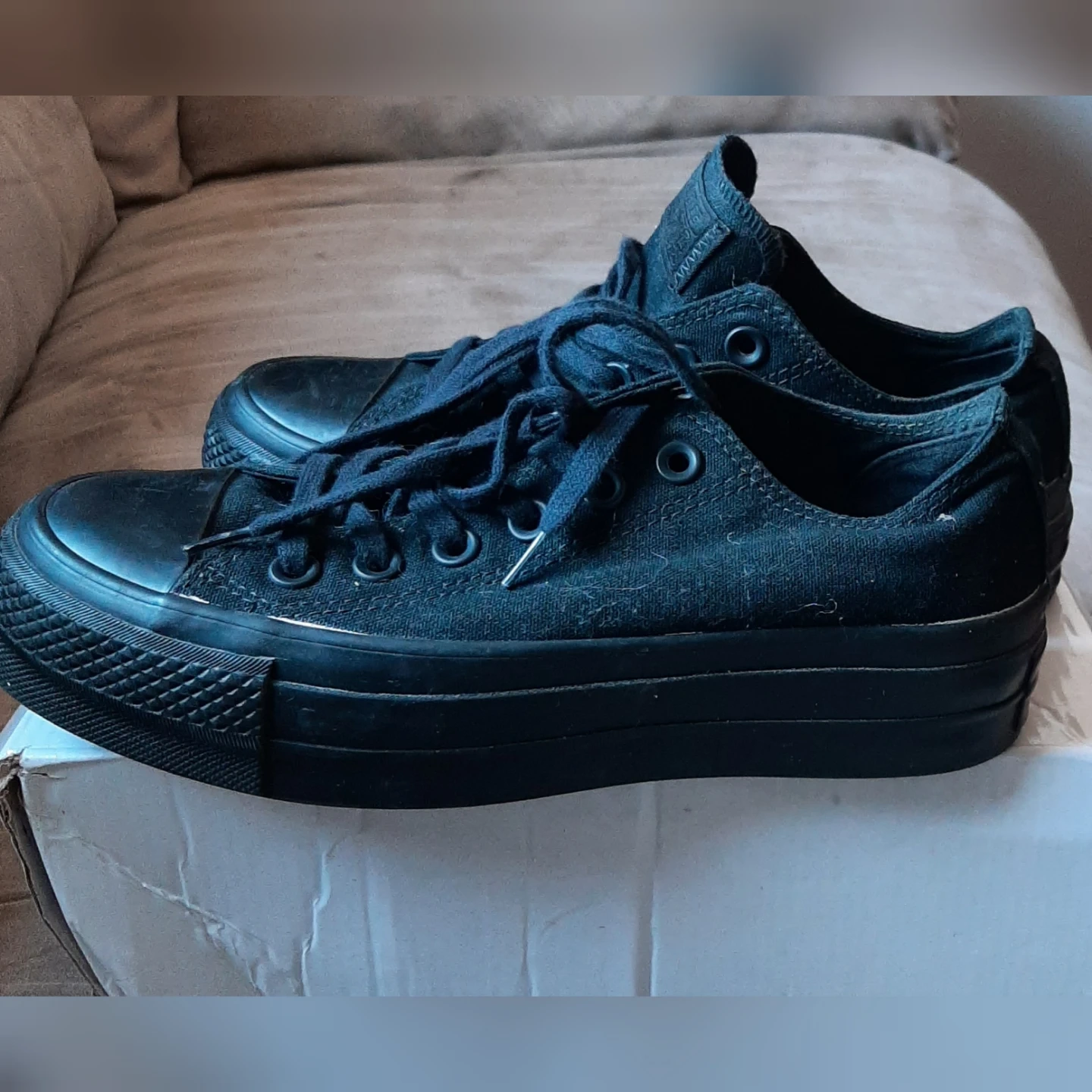 Black Converse platform sneakers. Women's US size 6.5, UK size 4.5, EUR size 37. These feature the classic Chuck Taylor design with a thick platform sole. They're made from canvas material.
