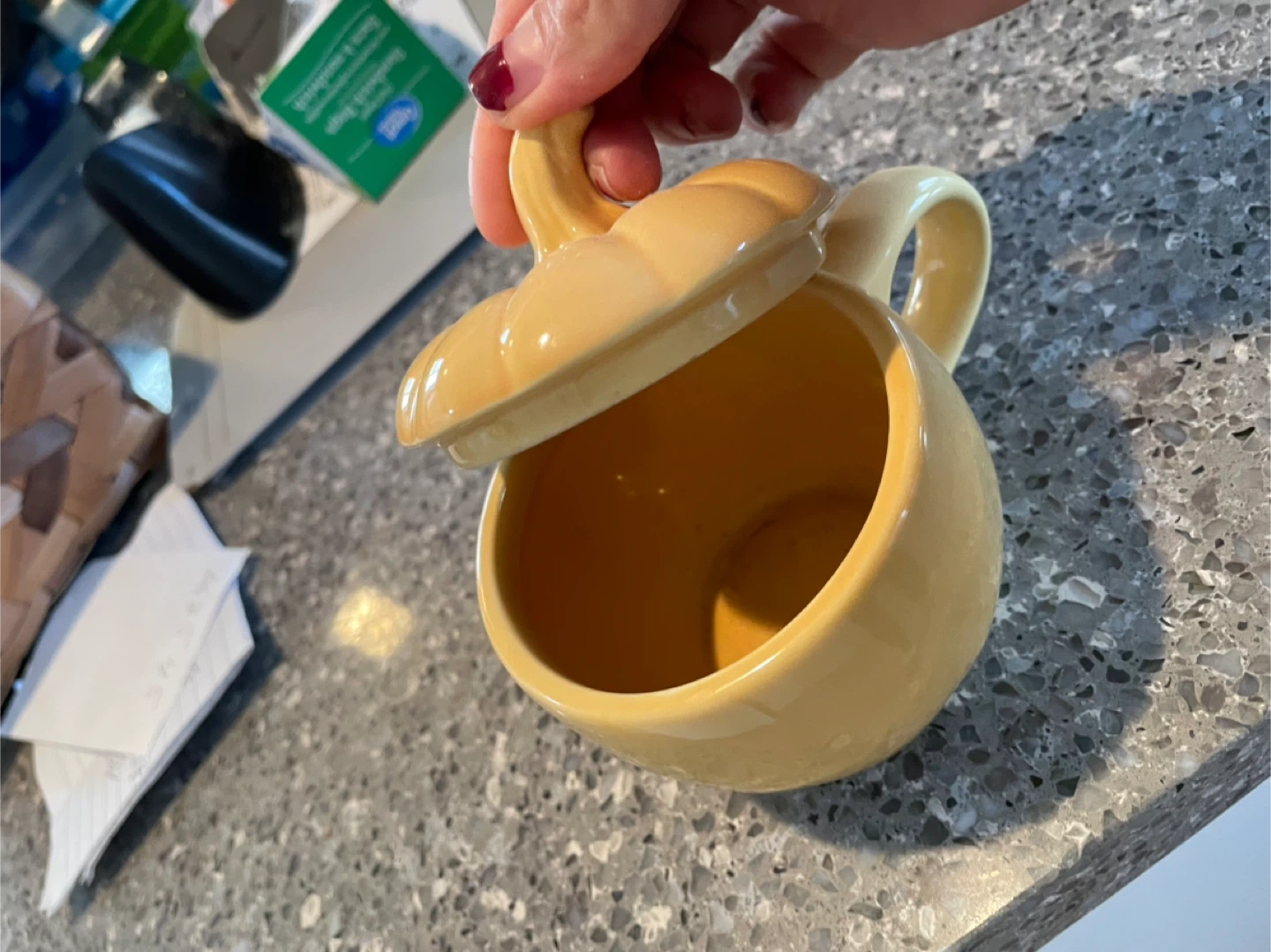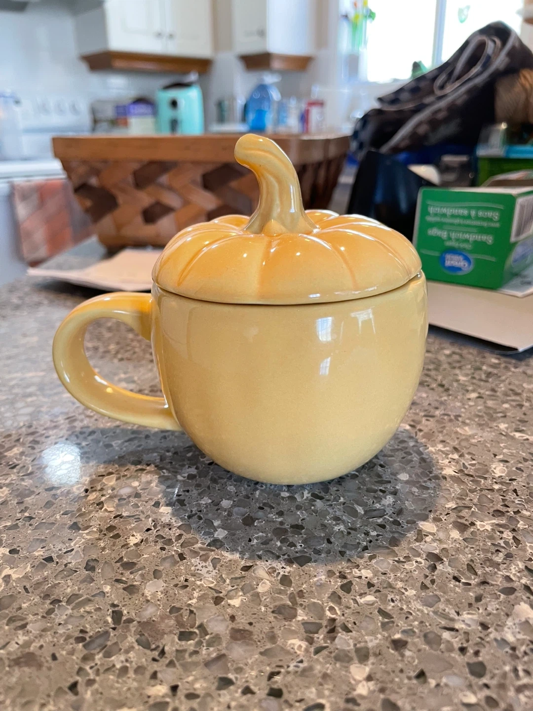 Cute ceramic mug shaped like a pumpkin. It comes with a matching lid and has a handy handle. Perfect for enjoying your favourite warm beverages during the fall season!