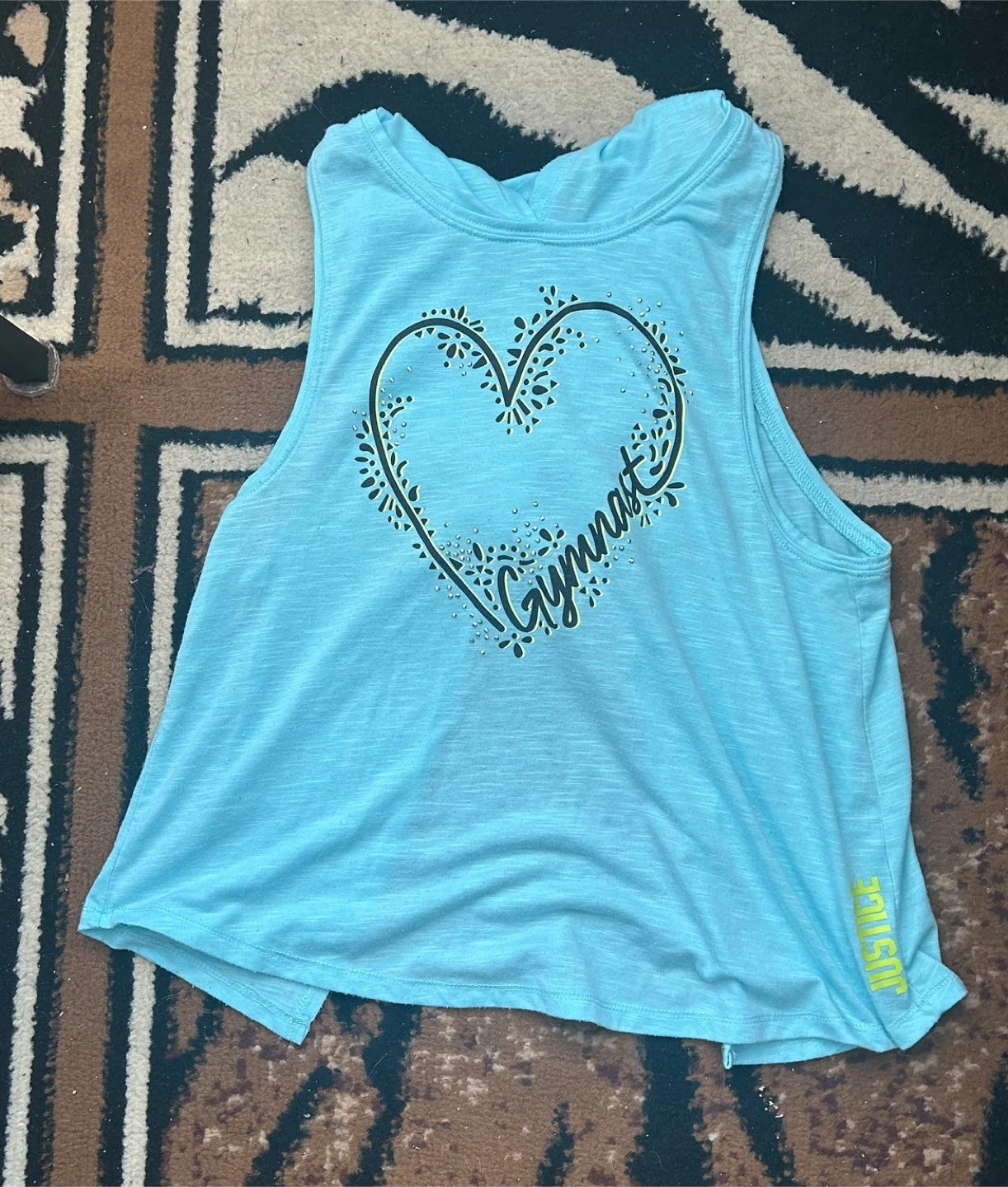 This is a light blue sleeveless tank top from Justice Active. It features a heart graphic with 'Gymnast' inside. The back has a hooded detail with a split design. Size is 12.