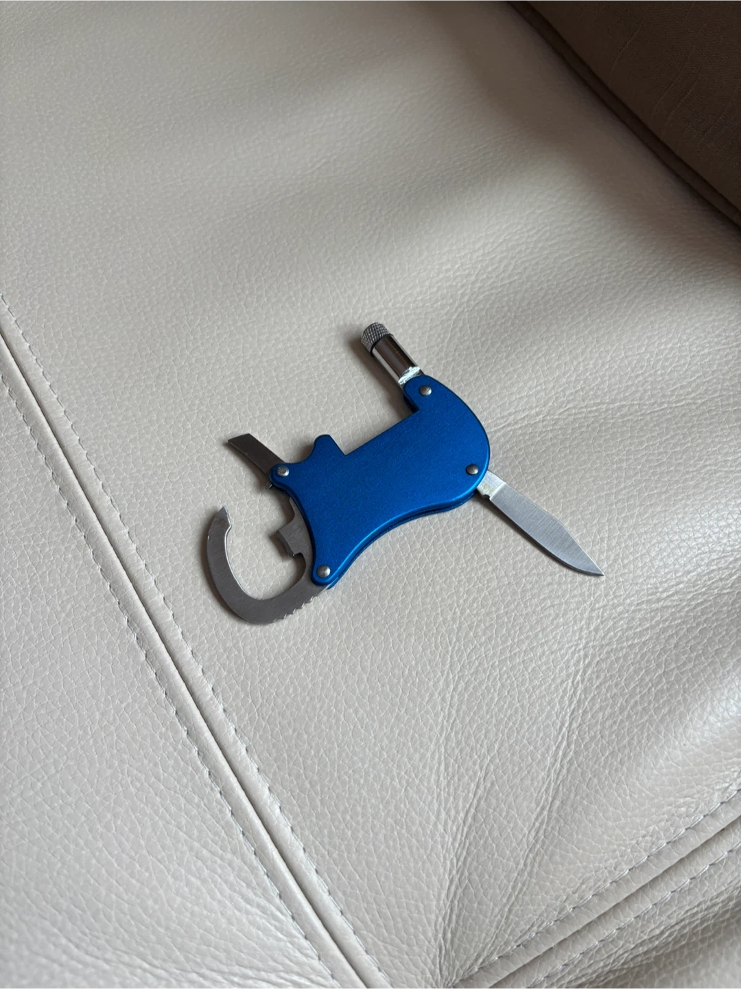 This branded multi-tool is a handy keychain accessory. It includes a small knife, bottle opener, and a built-in light (doesn’t work, maybe needs new batteries). Can be used as a keychain as well. Compact and blue, it's useful for everyday tasks. It's a great addition for anyone needing a quick tool on the go!