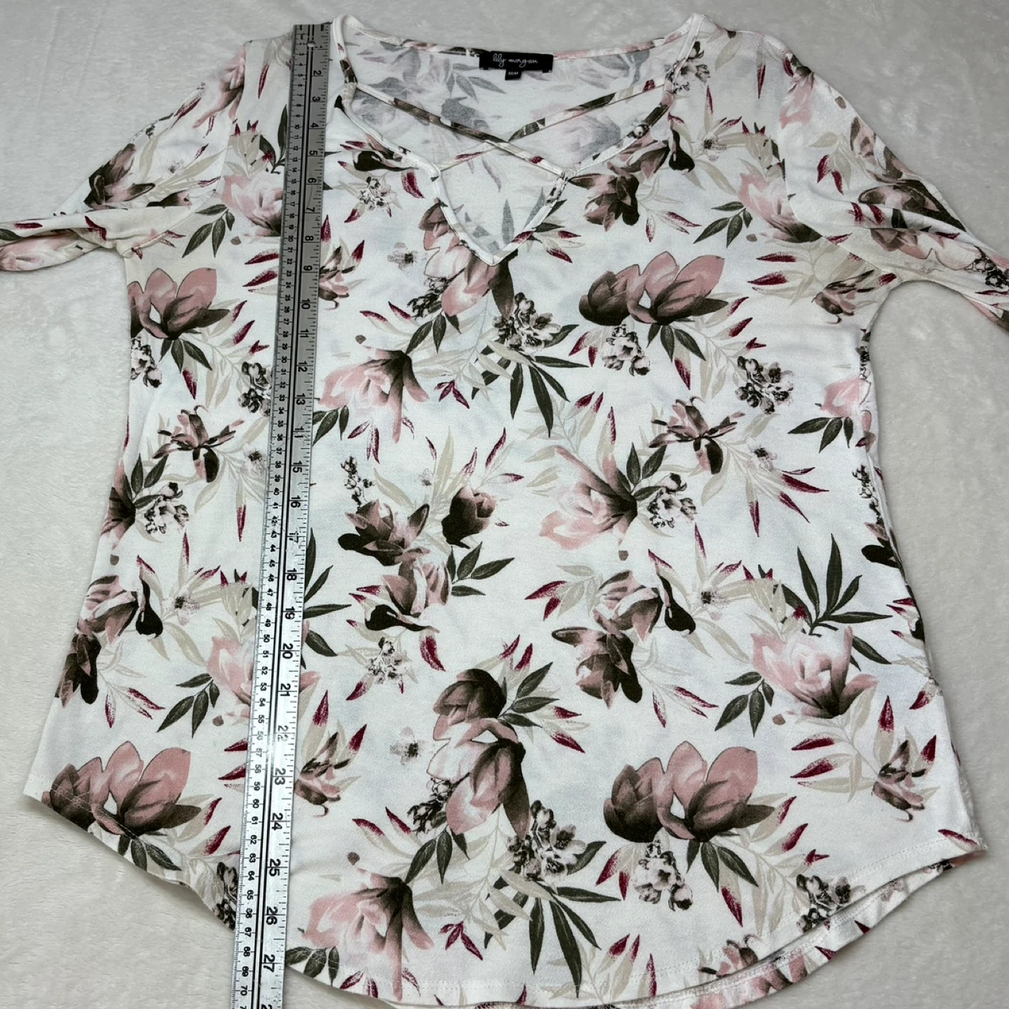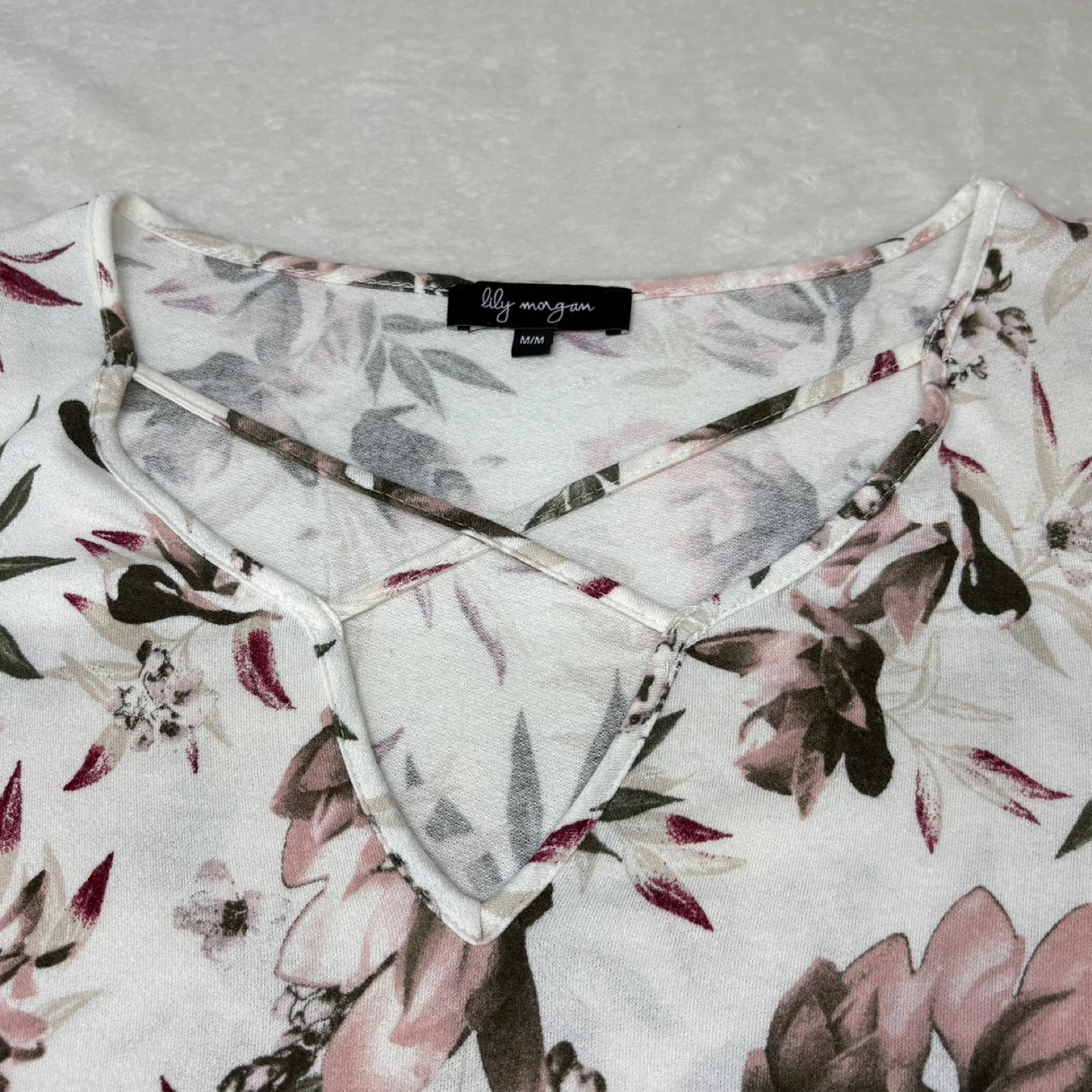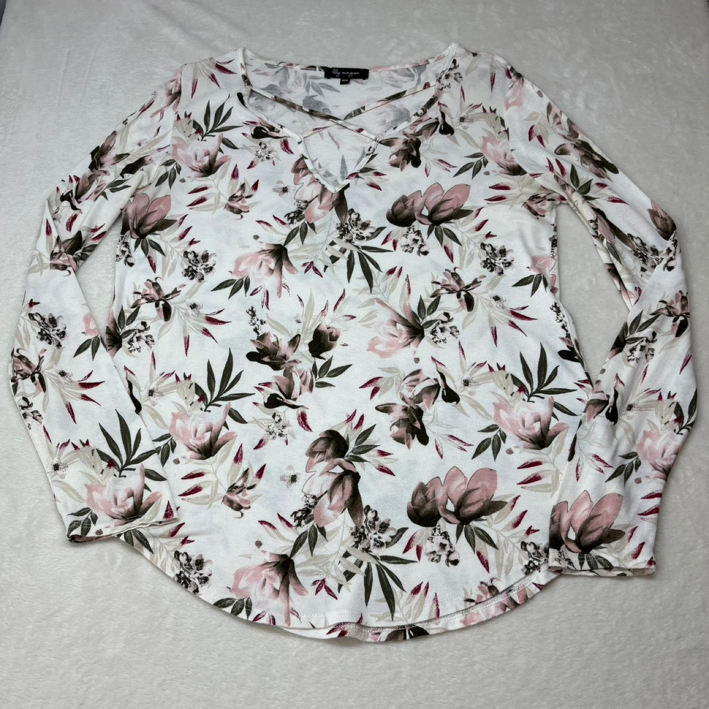 This beautiful Lily Morgan top features a soft white fabric with a pink and green floral print. It has a relaxed fit, long sleeves, and a stylish criss-cross detail at the V-neckline. While the tag is a Medium, it has a generous cut that fits more like a Large. Perfect for casual wear or layering, this top offers a comfortable yet put-together look.
