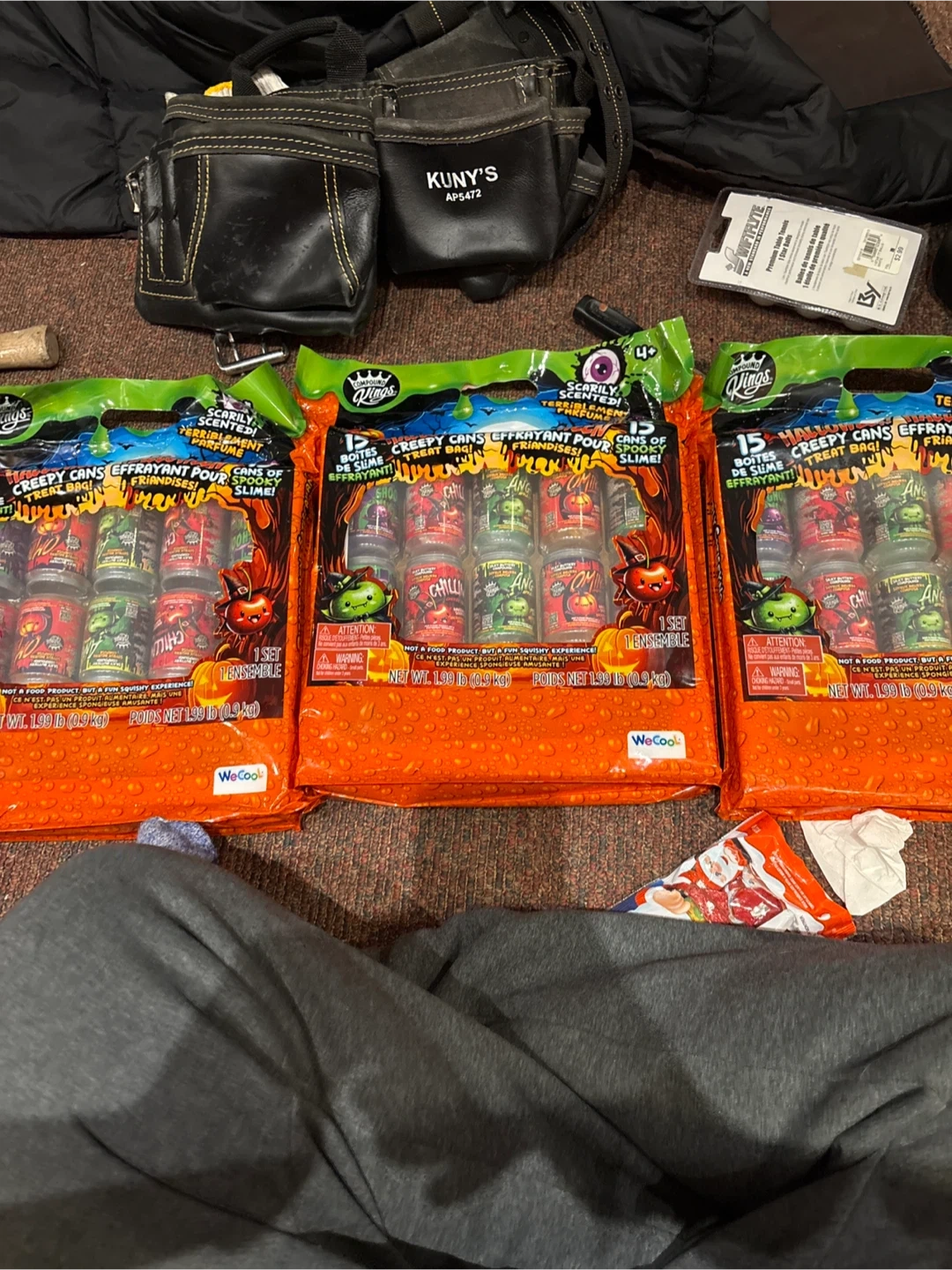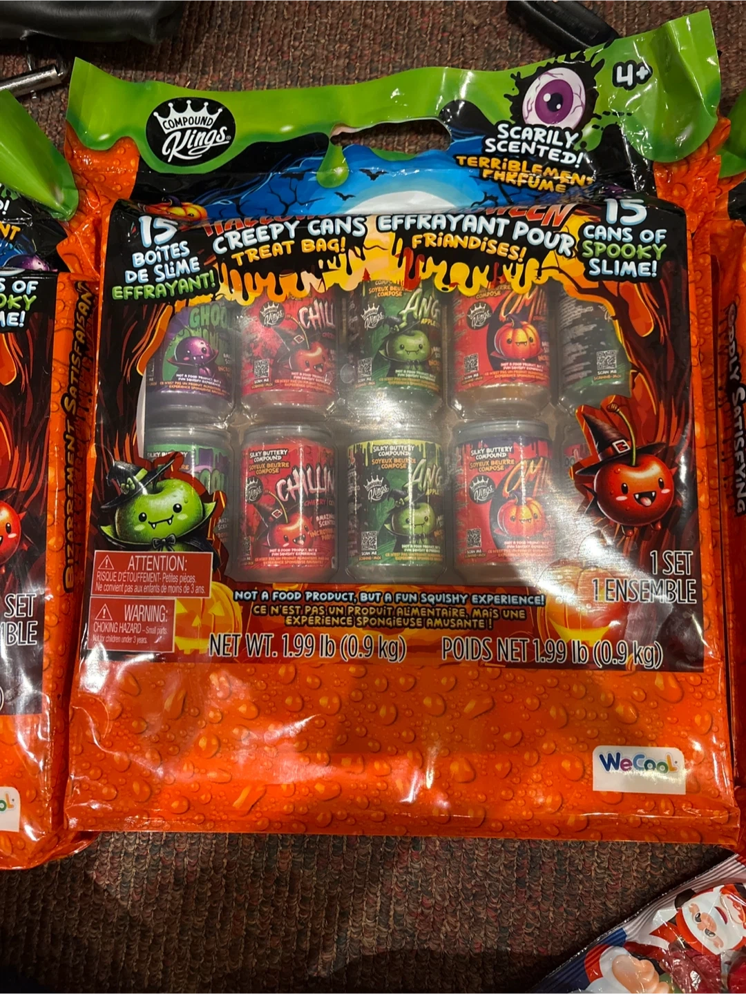 This set includes 15 creepy cans of effervescent slime treat bags. Each bag contains "Goo", "Chill", and "Spooky" slime. It's a fun squishy experience for kids