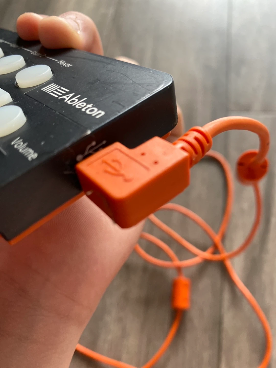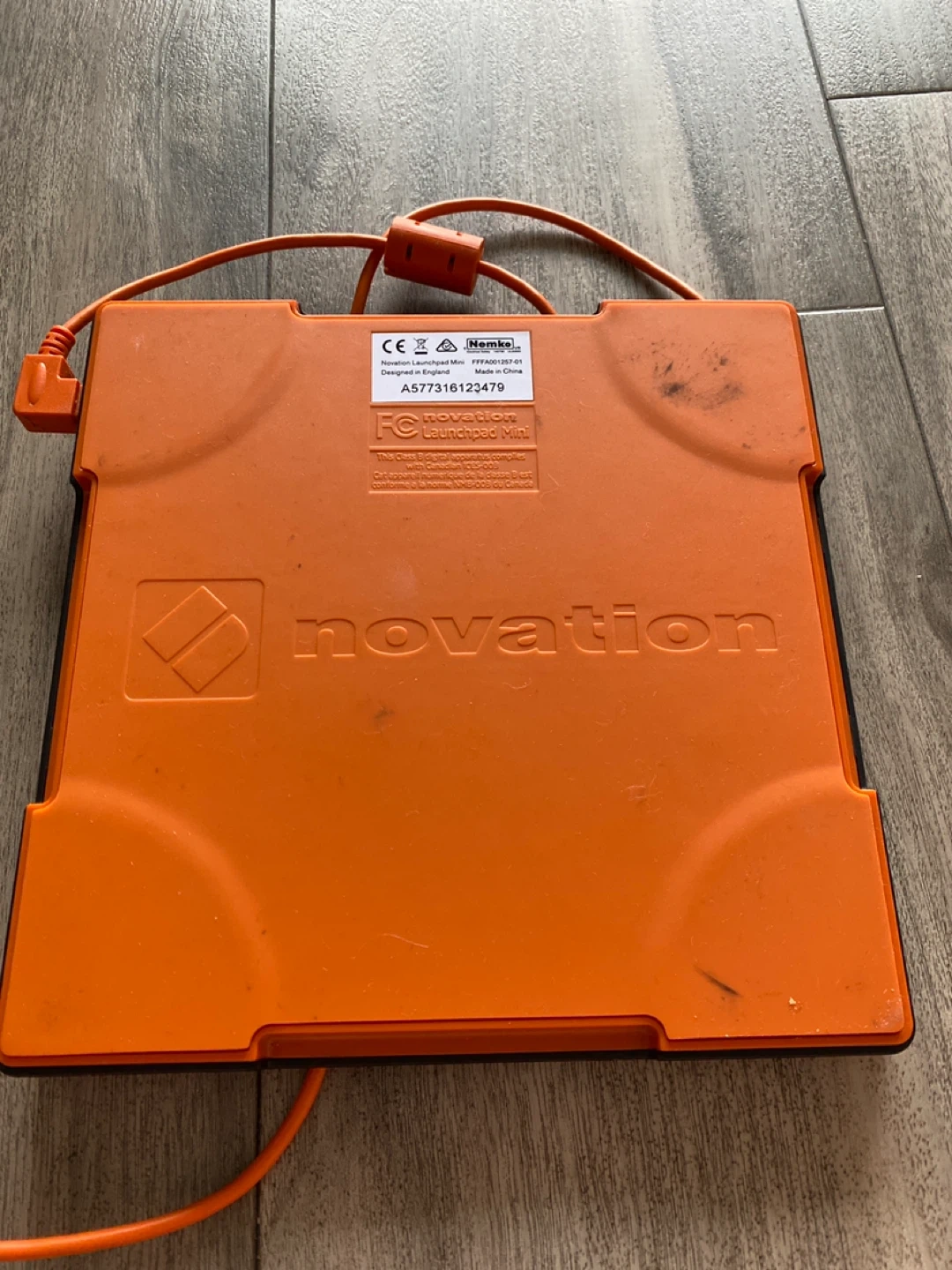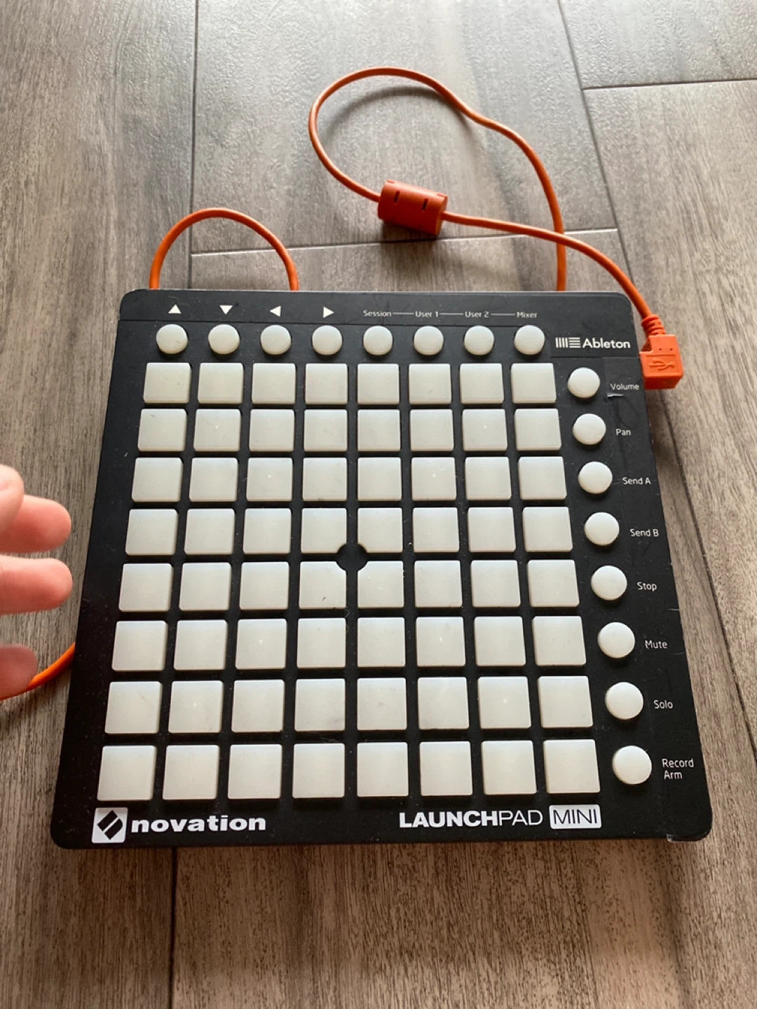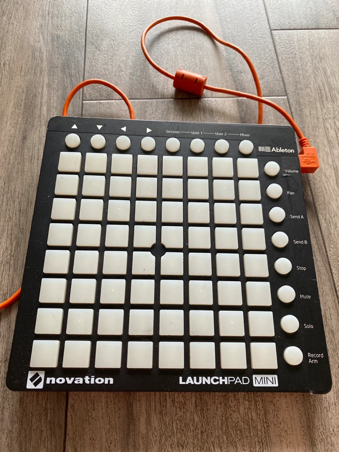 Novation Launchpad Mini controller for Ableton. Connects via USB. Includes grid of backlit pads and dedicated buttons for session control. It's a compact music production tool.
