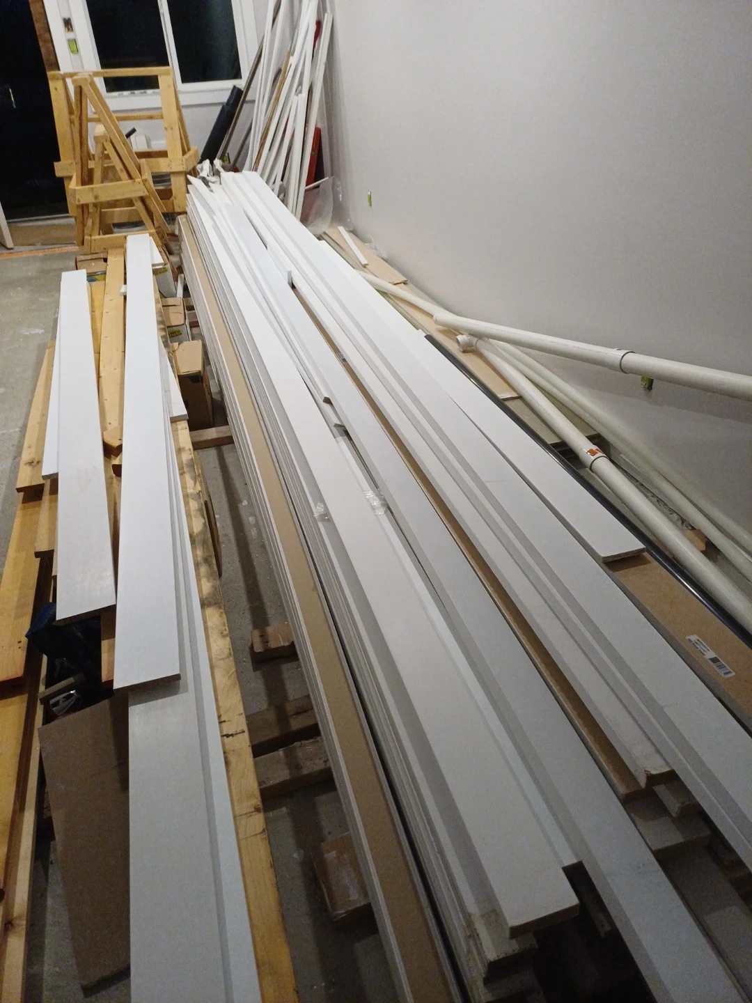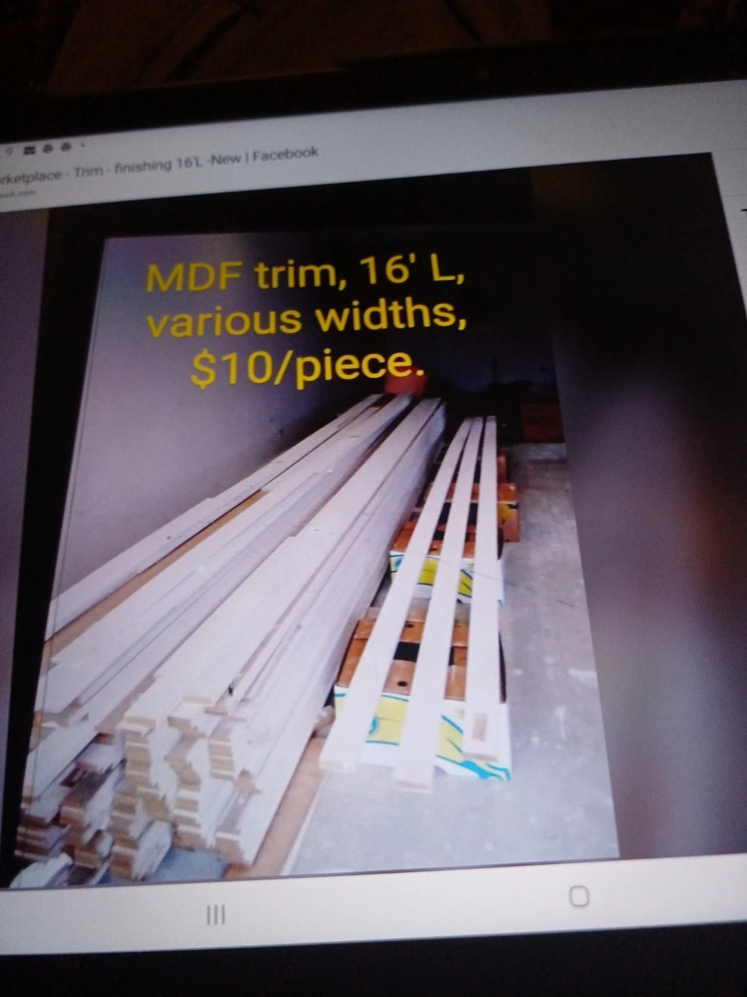 Selling assorted MDF trim pieces, each 16 feet long. These are available in various widths and are perfect for home renovation projects. Priced at $10 per piece.