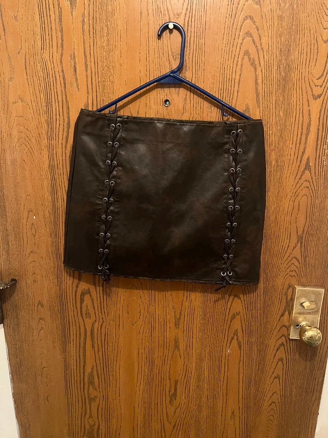 Dark brown mini skirt with lace-up detailing on the sides. It's a faux leather material and appears to be a size small. Adds a bit of edge to any outfit!
