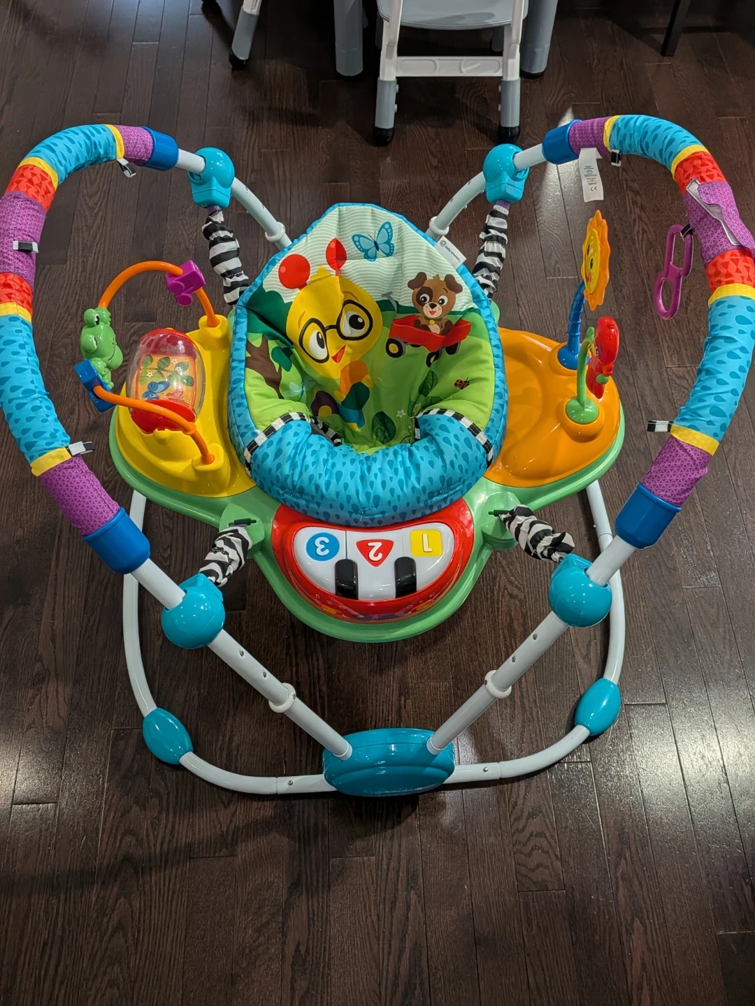 This Baby Einstein Neighborhood Friends Activity Jumper has 12+ toys and activities to keep your little one entertained. It features 3 languages to discover and a 360-degree seat.