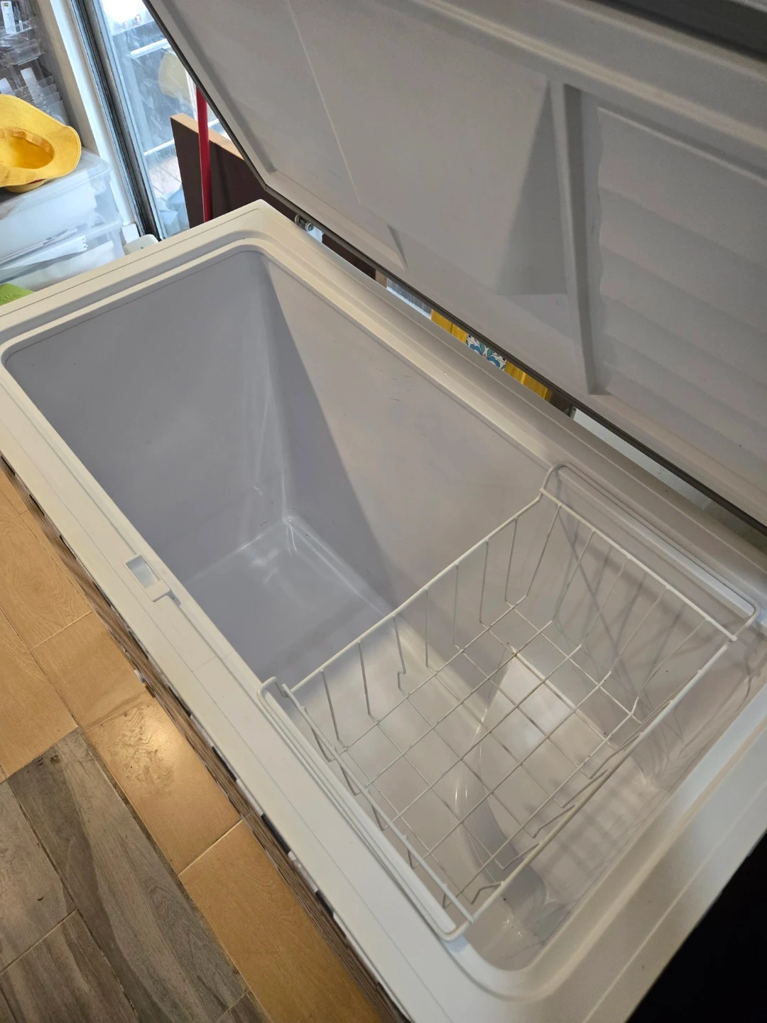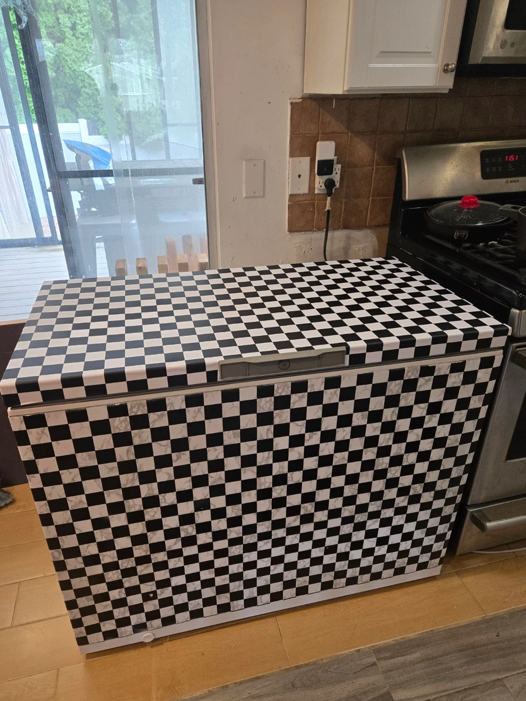 This chest freezer is white inside and features a fun checkered and marble decal on the exterior. It includes a removable wire basket for organization. Keeps your food frozen solid!