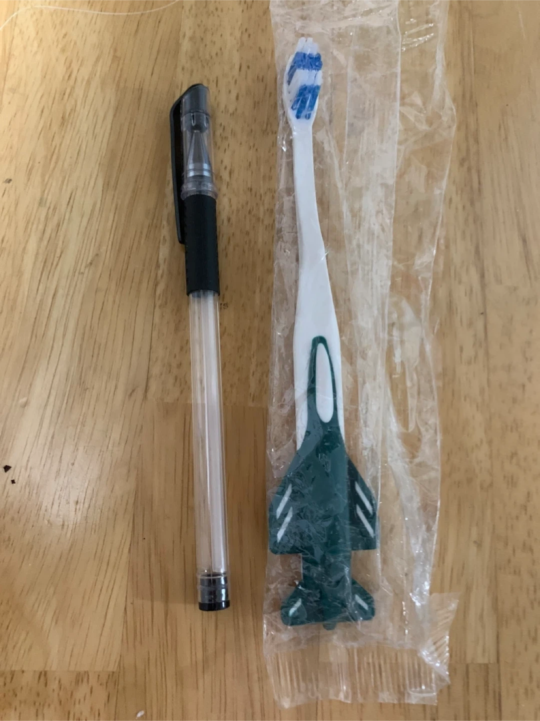 White toothbrush with blue and white bristles. Features a fun green airplane-shaped handle.