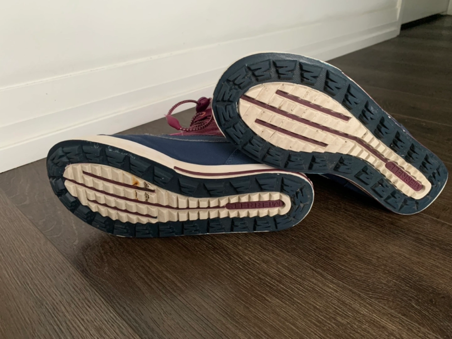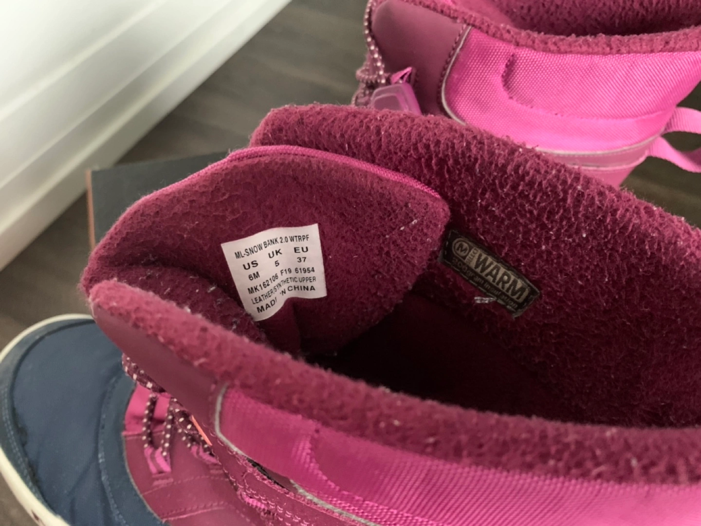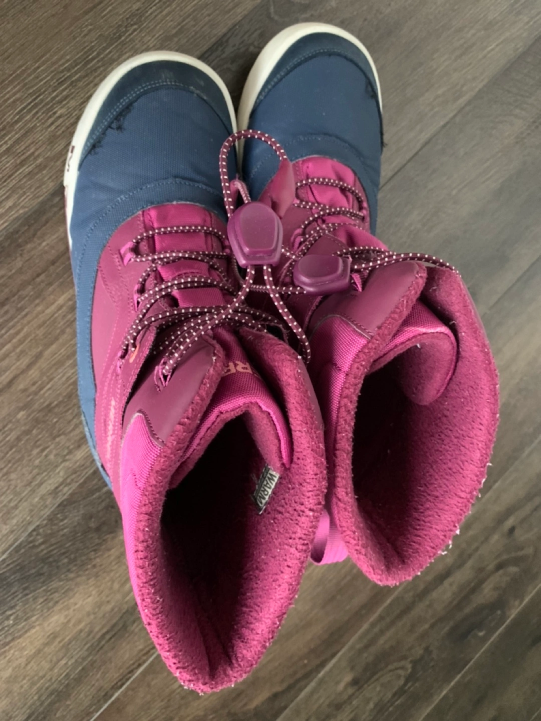Purple and navy blue waterproof winter boots. Easy to match with any color. Lace-up style with a pull tab. Good condition. Comes in original box.