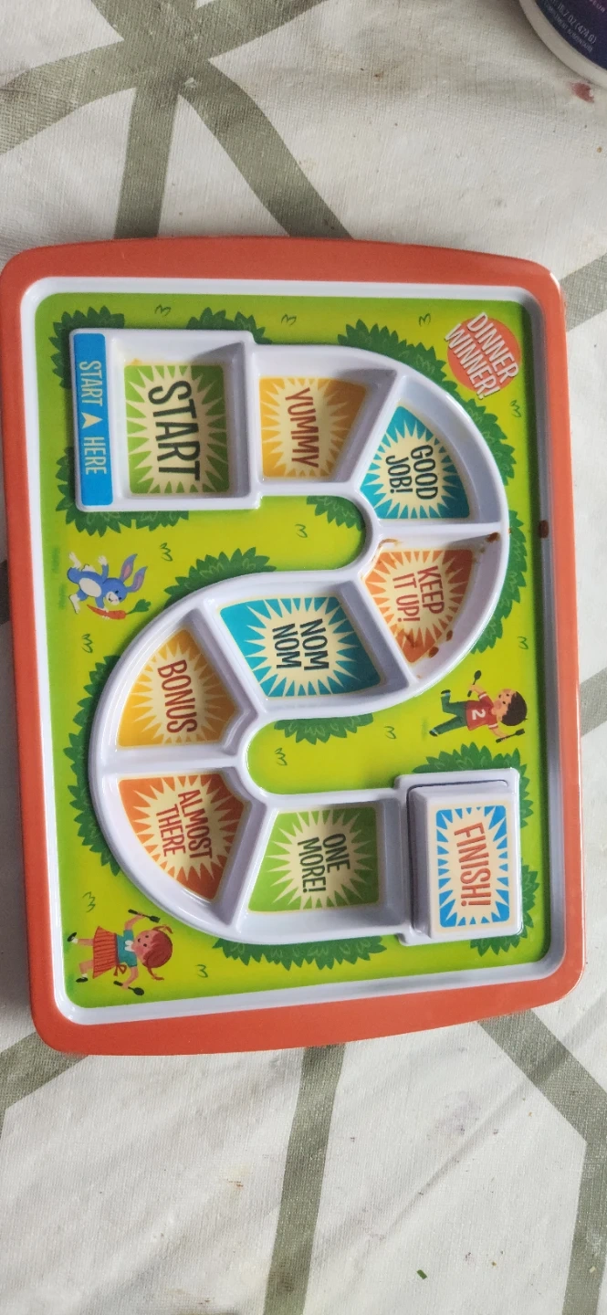 Fred DinnerWinner divided plate for kids. It features different sections like 'Start Here', 'Yummy', 'Nom Nom', and 'Finish'. This plate helps make mealtime fun for picky eaters!