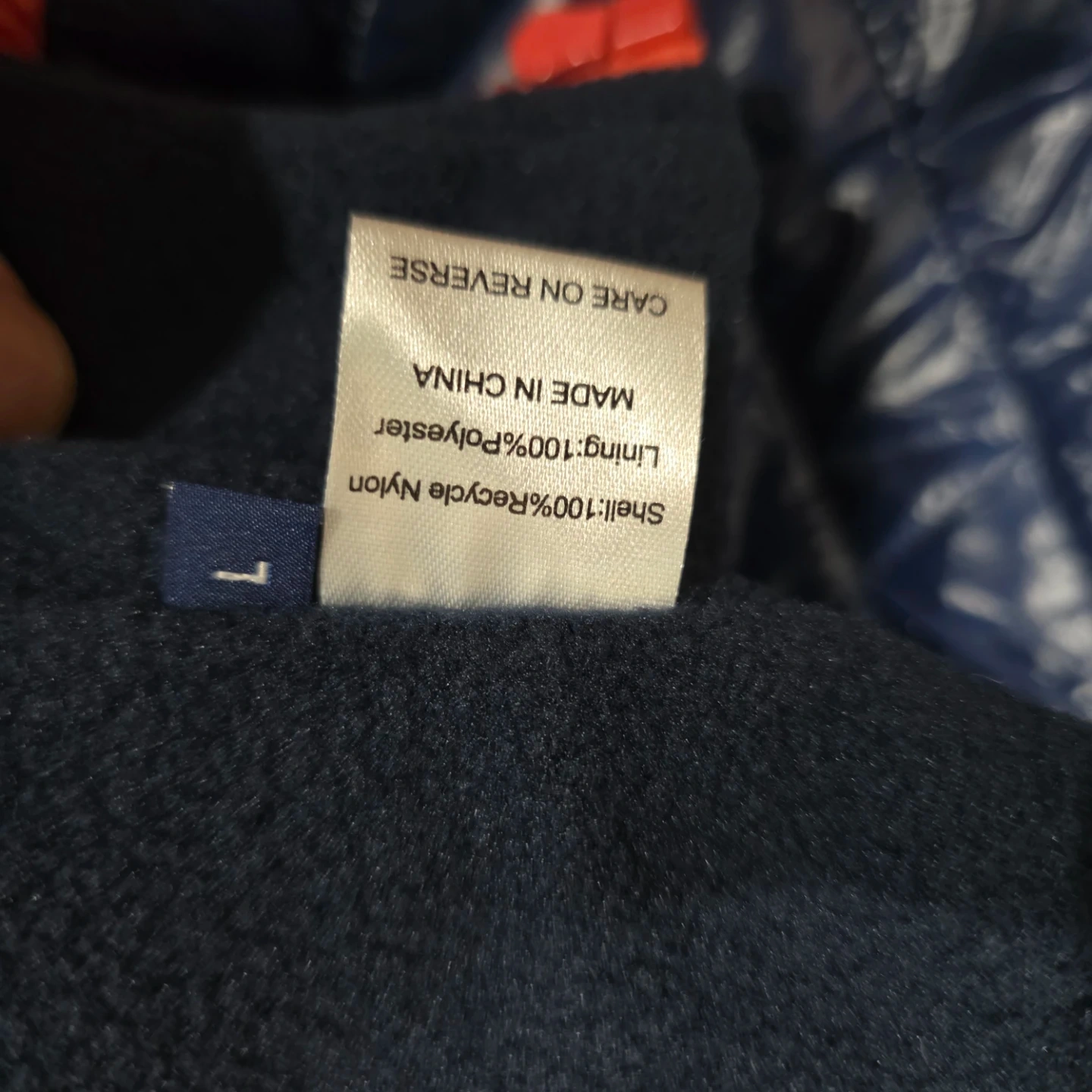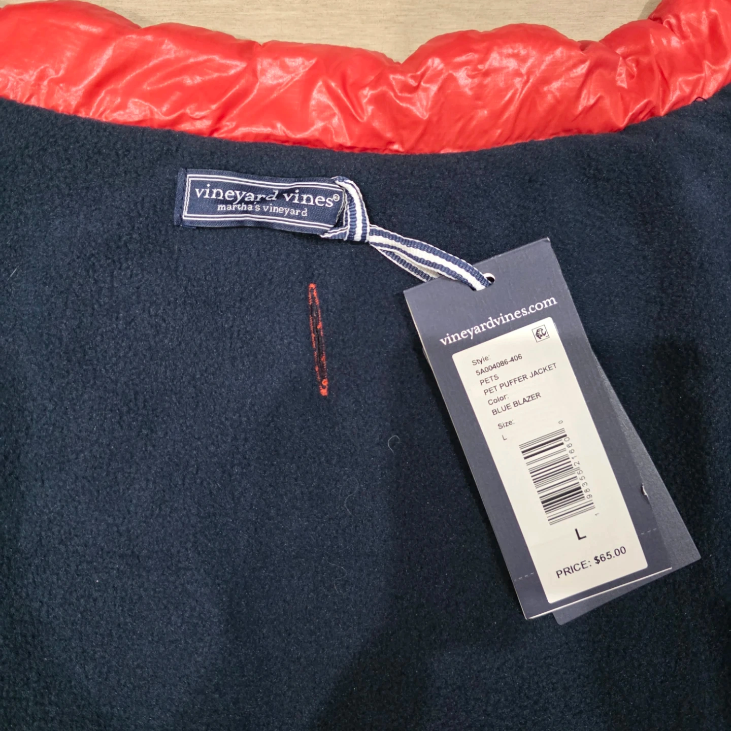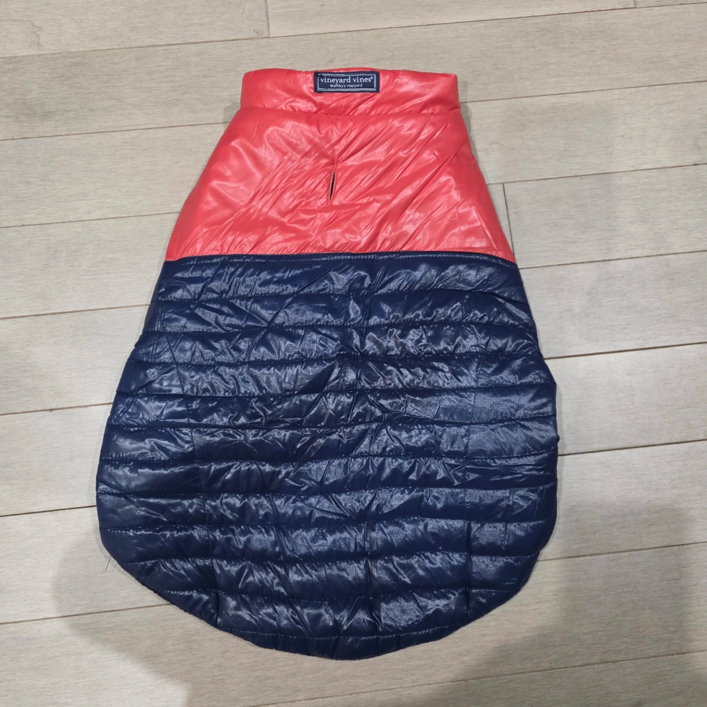 This Vineyard Vines dog vest is quilted and features a red and navy color block design. It has a soft fleece lining for warmth. Zipper closure with velcro fasteners. Size L.