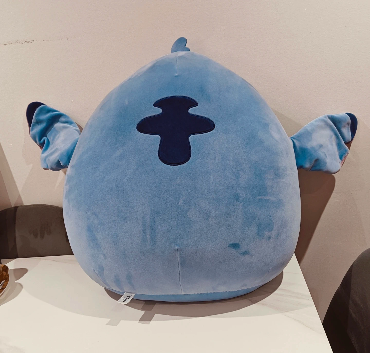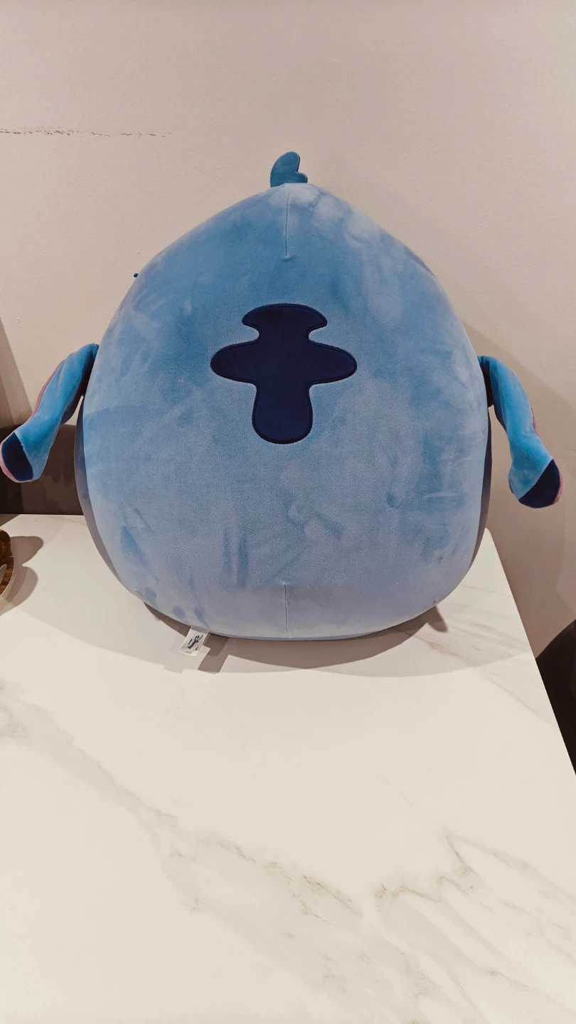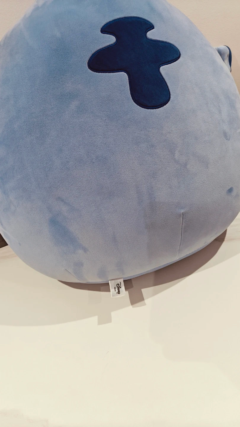 This is a large, soft blue plush toy featuring the character Stitch from Disney. It's incredibly huggable and made for cuddling. A fun addition for any Disney fan's collection!