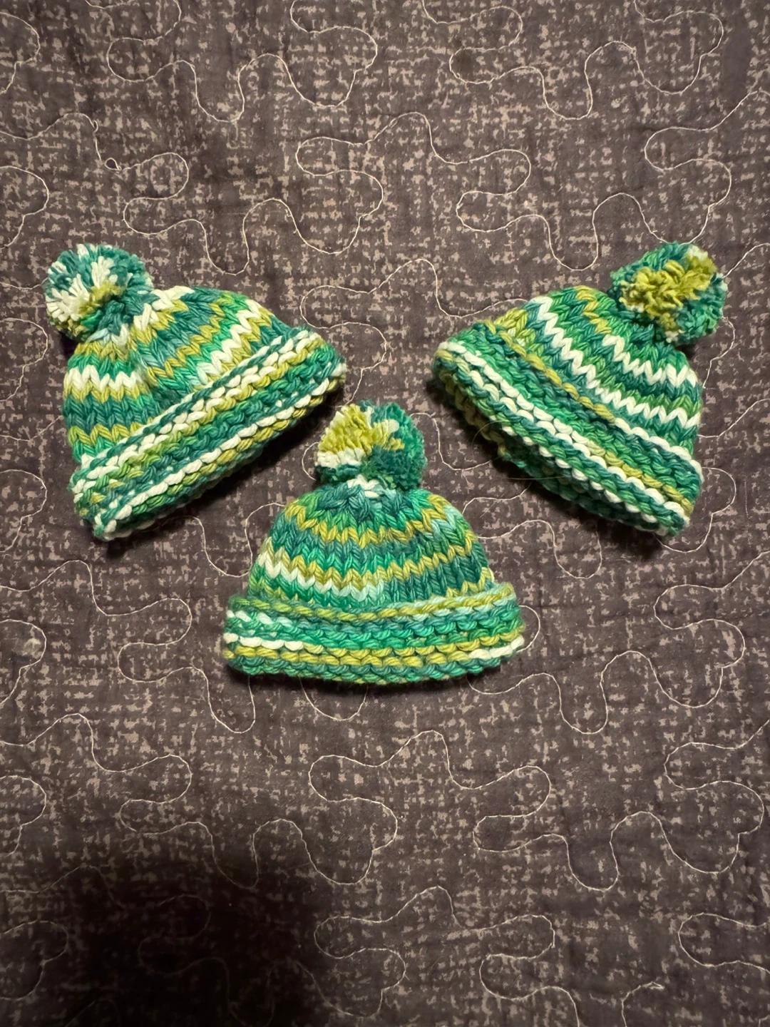 Adorable hand knit green hats made from 100% cotton β perfect for crafts, stocking stuffers, little kids, or adding a cute touch to gifts!