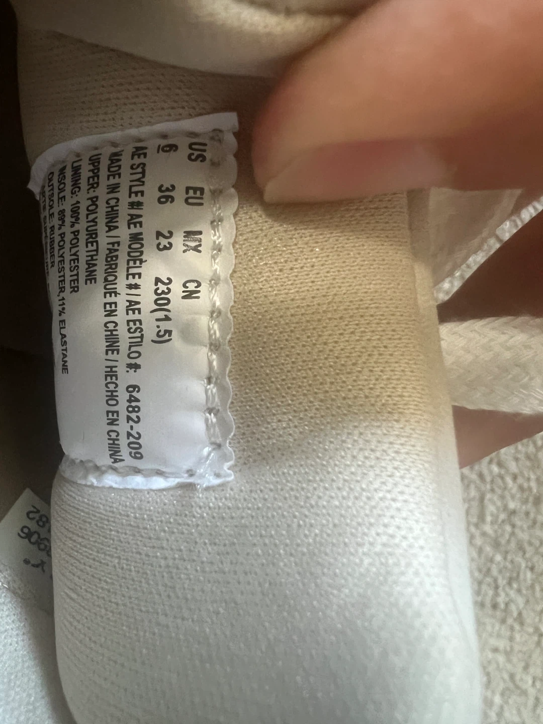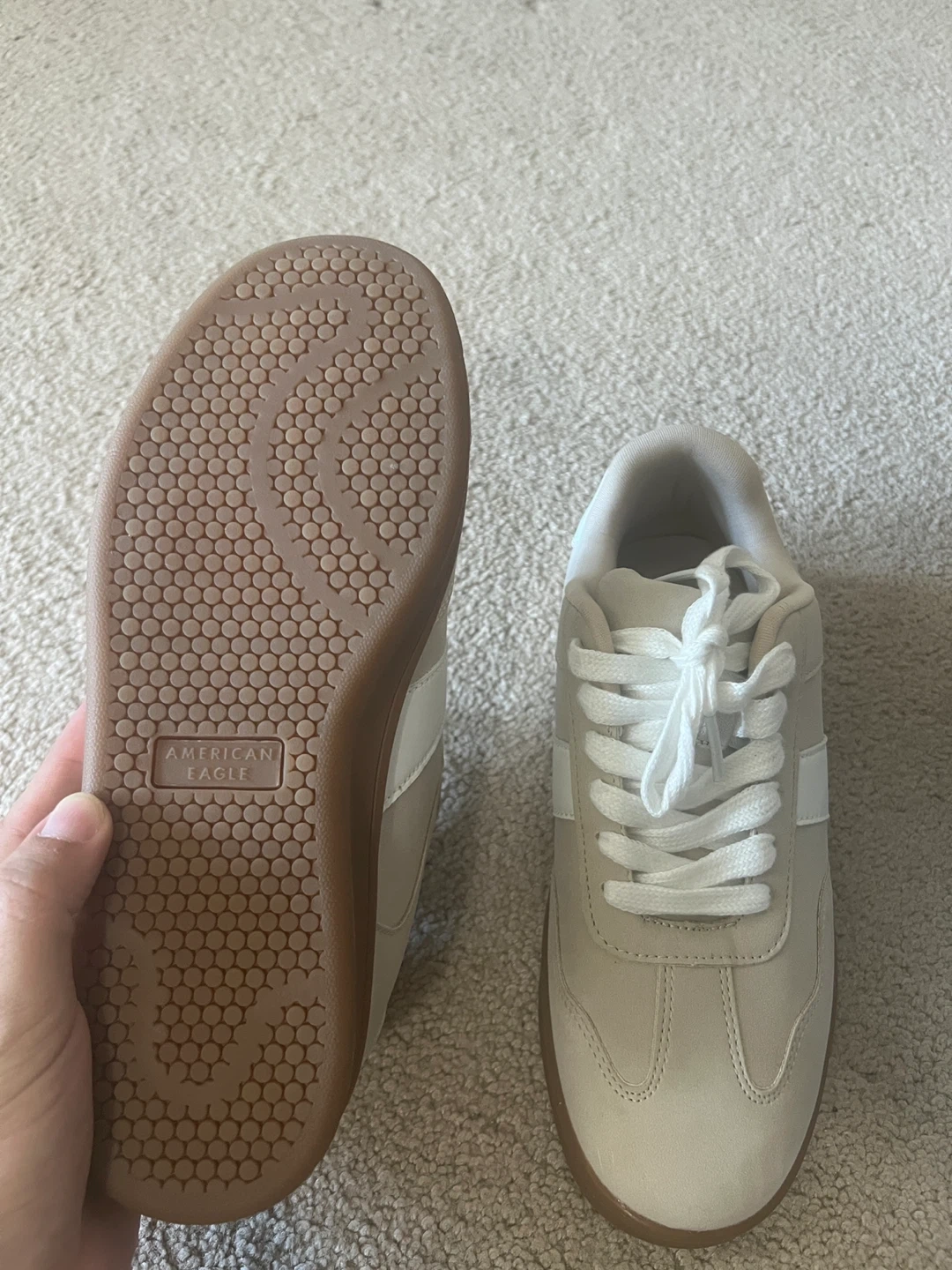 These are American Eagle sneakers in a light beige colour. They're made with a polyurethane upper and a rubber outsole. This style is 230 CN (1.5). Great for everyday casual wear!