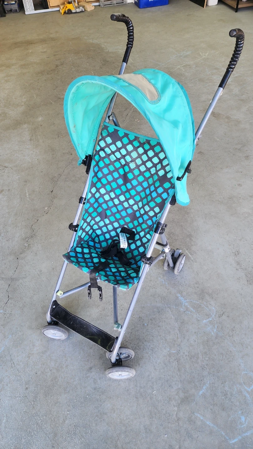 This is a lightweight umbrella stroller with a teal canopy and a black and teal patterned seat. It folds compactly for easy storage and transport. It's suitable for quick trips out and about.
