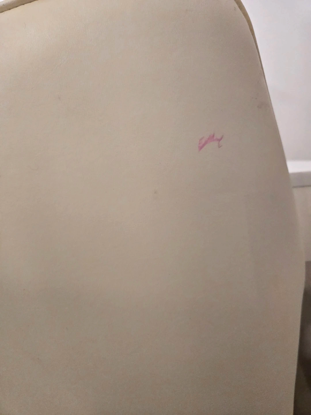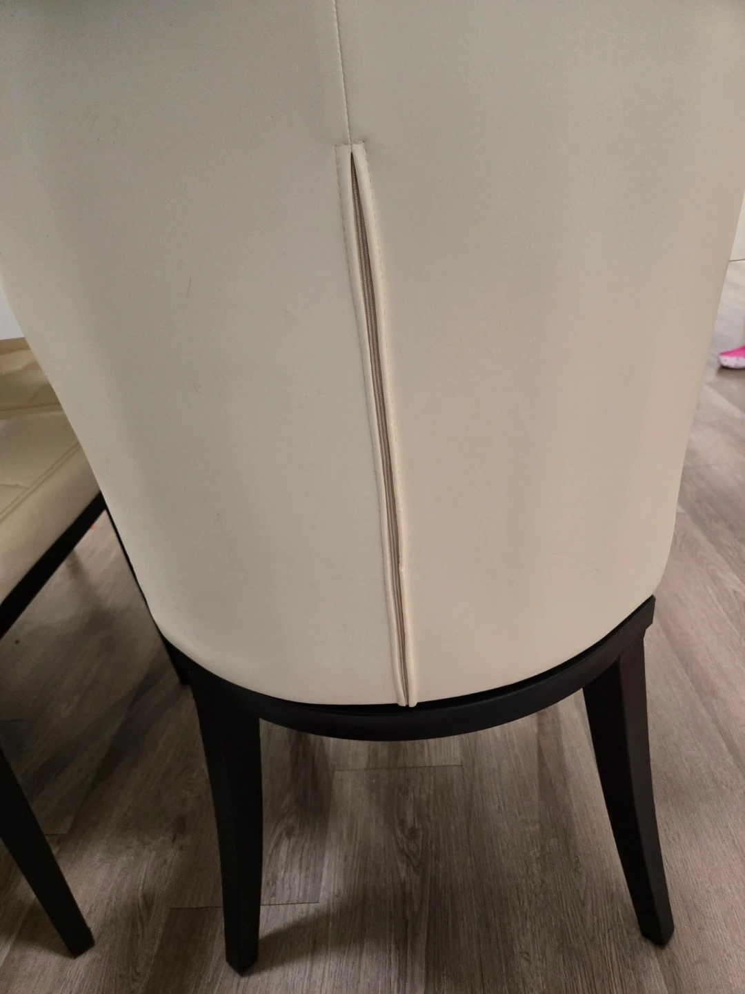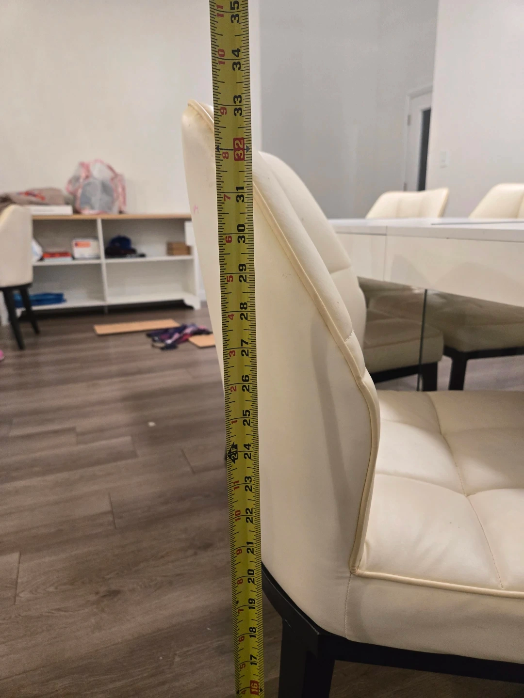 These dining chairs feature cream-colored upholstery with a tufted design. The legs are dark wood. There's a small pink mark on one chair's back. These chairs offer comfortable seating for your dining room. Measurements of table are 29.5"H x 31.5"W x 78 3/4" L.