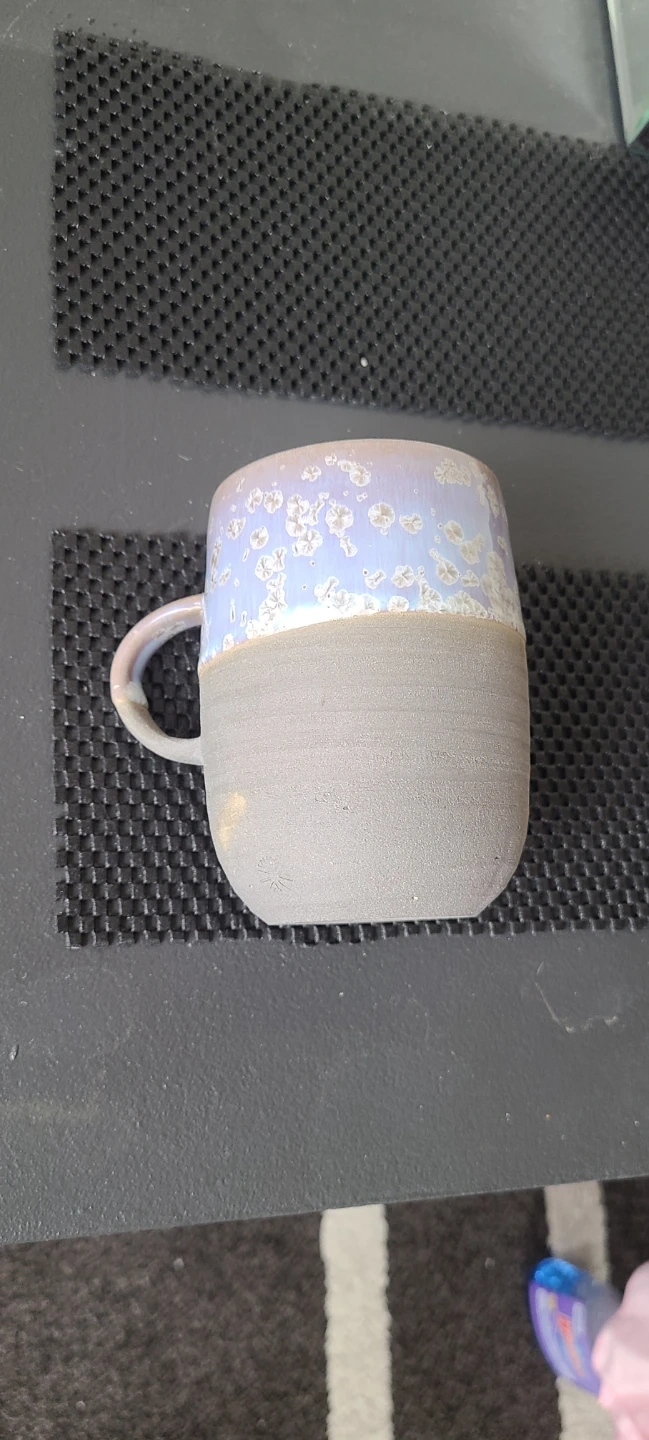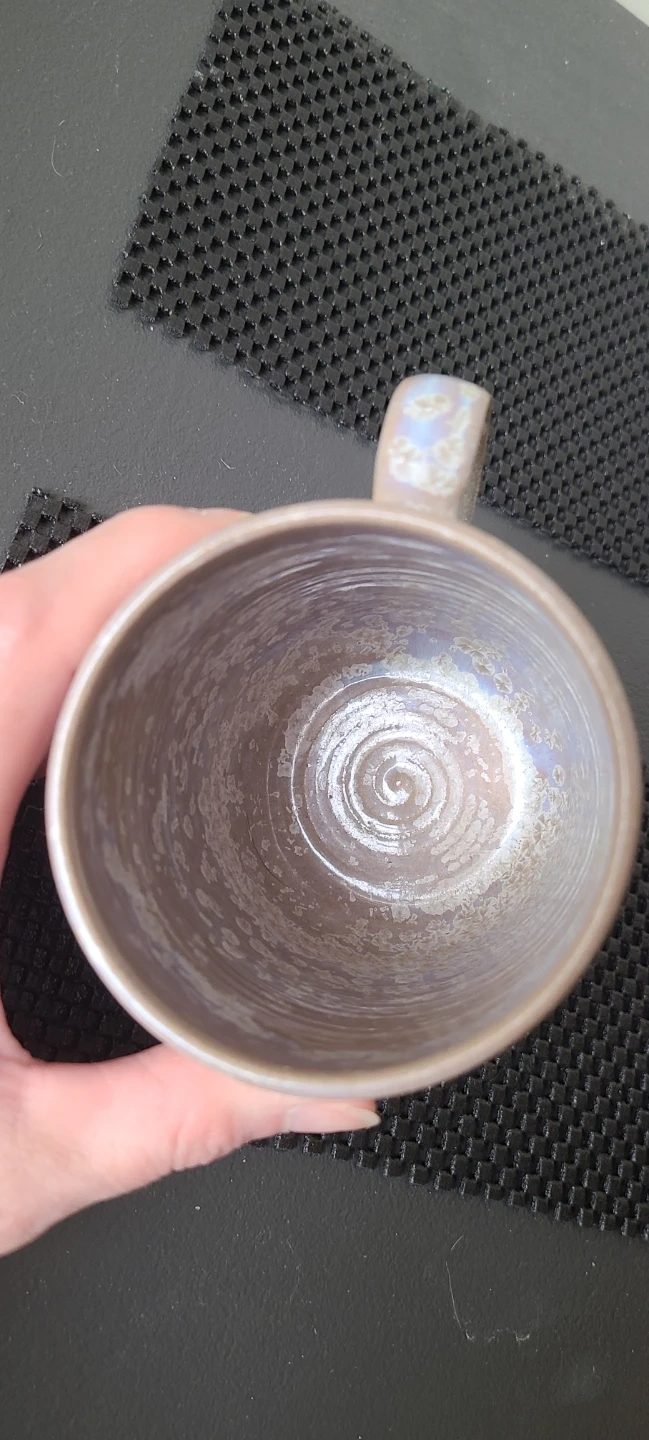 A unique handmade ceramic mug with a speckled iridescent glaze. It's perfect for enjoying your morning coffee or tea. The sturdy handle and solid base make it a pleasure to hold.