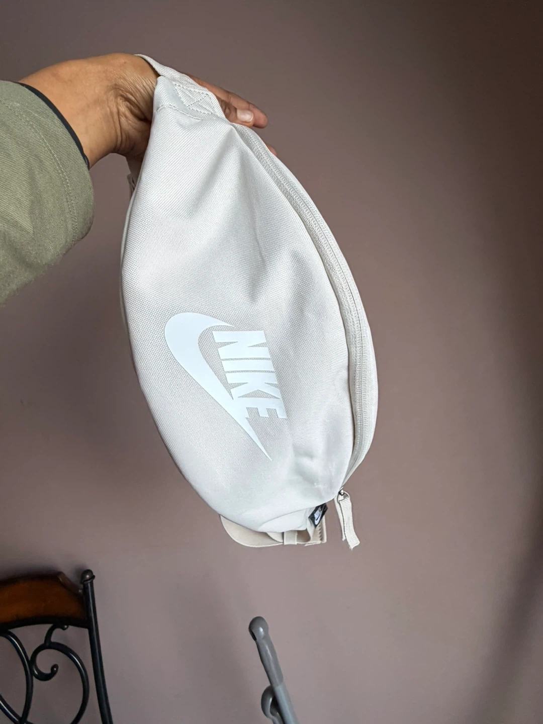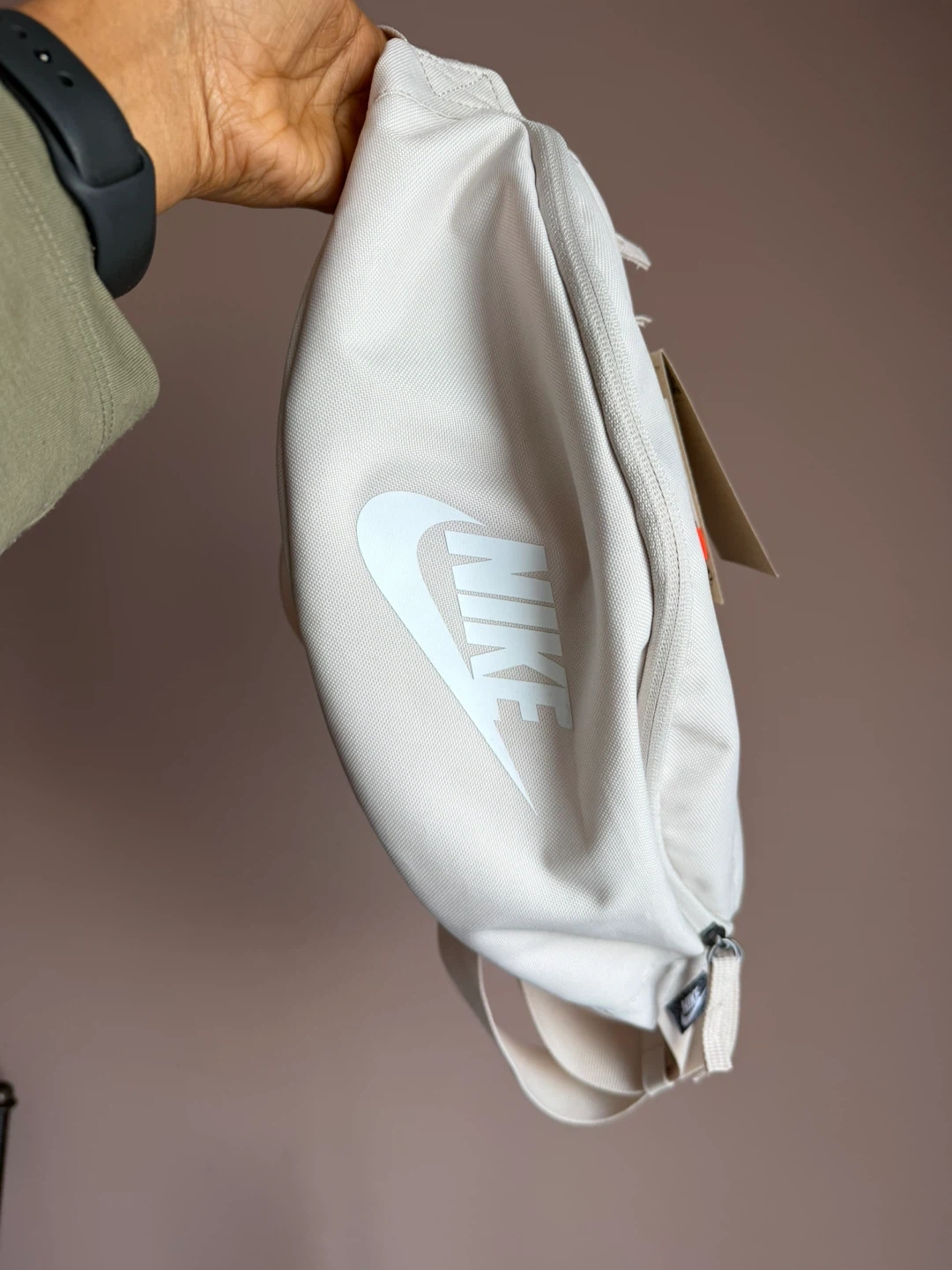 This Nike fanny pack is a versatile accessory, perfect for keeping your essentials close. It features the classic Nike logo and a durable, adjustable strap with a buckle closure. The light grey colour makes it easy to pair with any outfit!