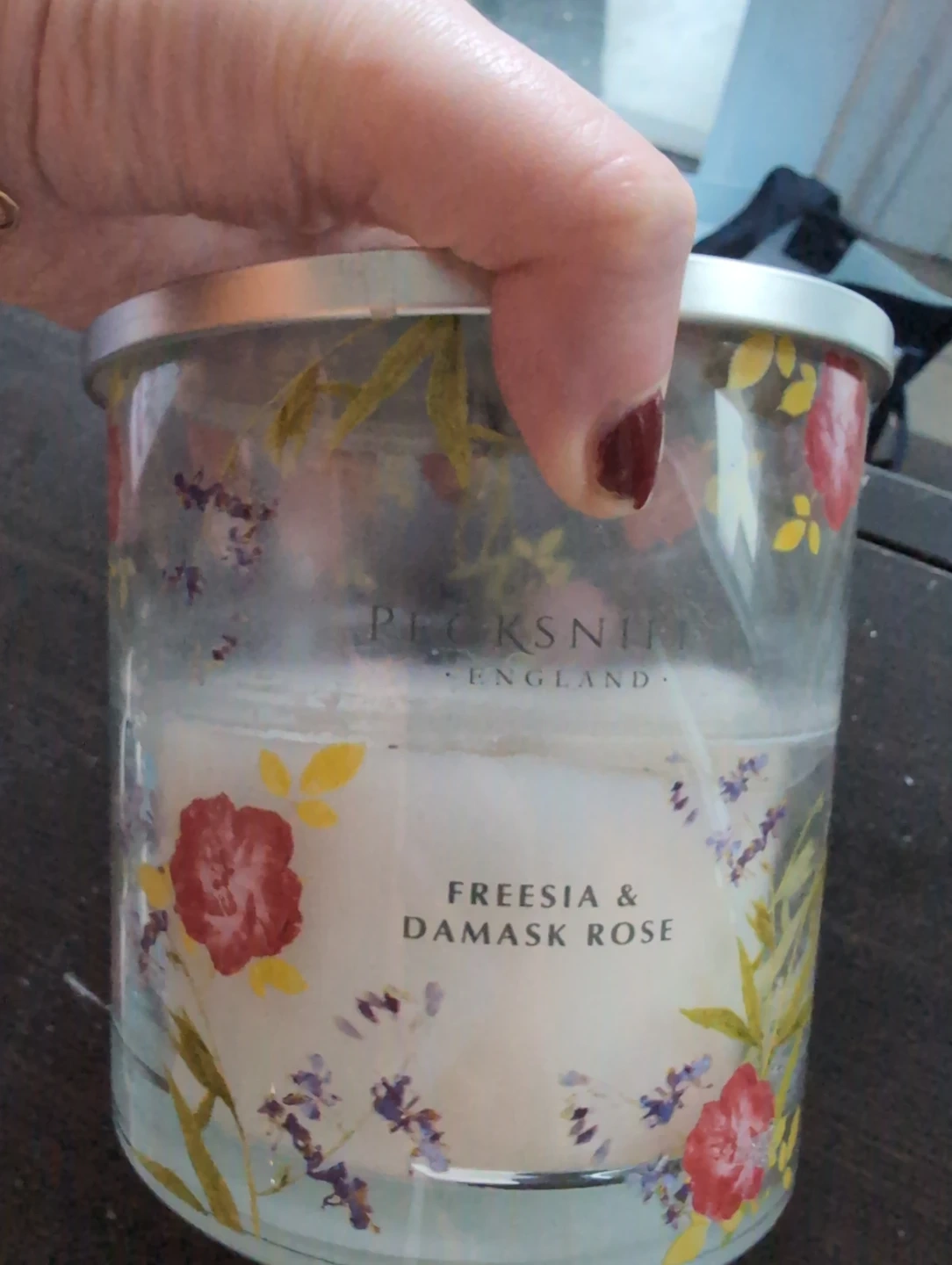 This is a Pecksniffs scented candle in a glass jar with a floral design. It has a Freesia & Damask Rose scent. The candle is in a clear glass container.