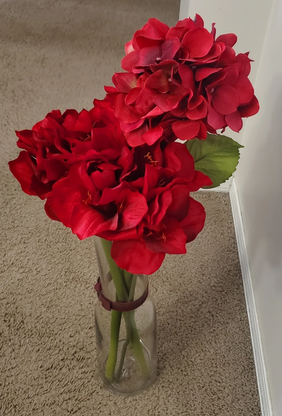 Set of red artificial flowers, including hydrangea and amaryllis blooms, presented in a clear glass vase. Stems are bound with a burgundy ribbon. These faux flowers add a pop of colour to any room.