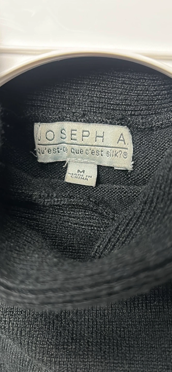 This is a JOSEPH A. black turtleneck sweater. It's a size medium. The material is "qu'est-ce que c'est silk?". Made in China.